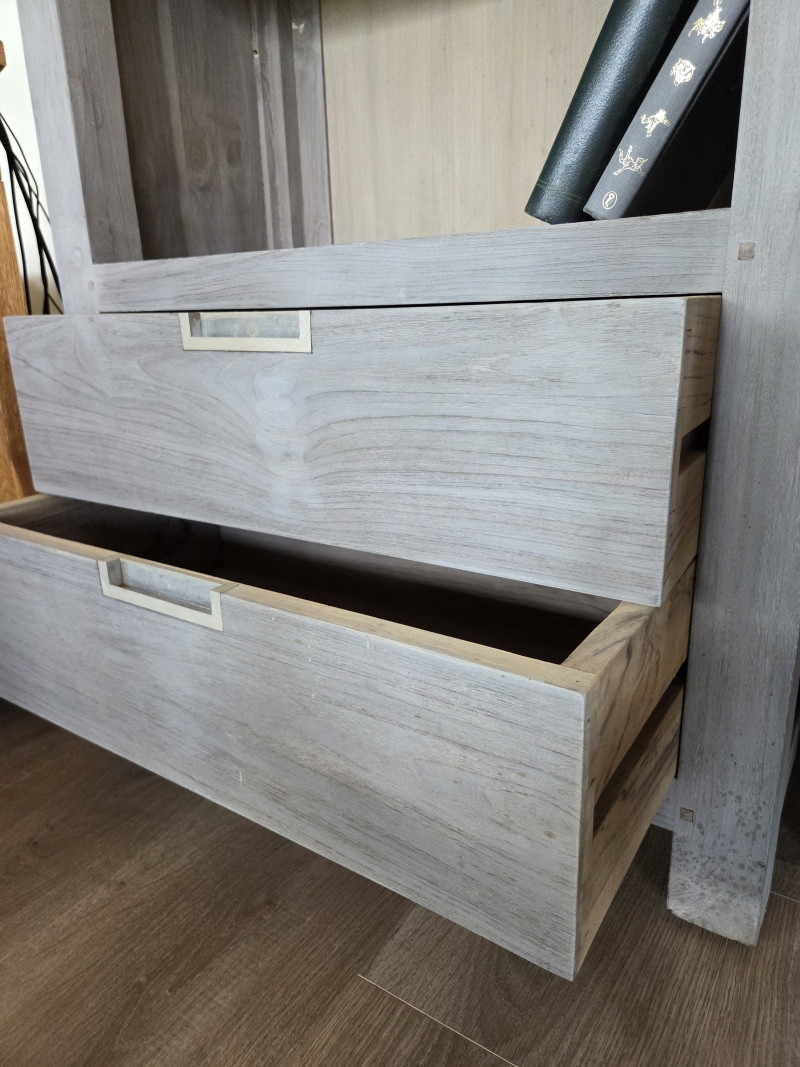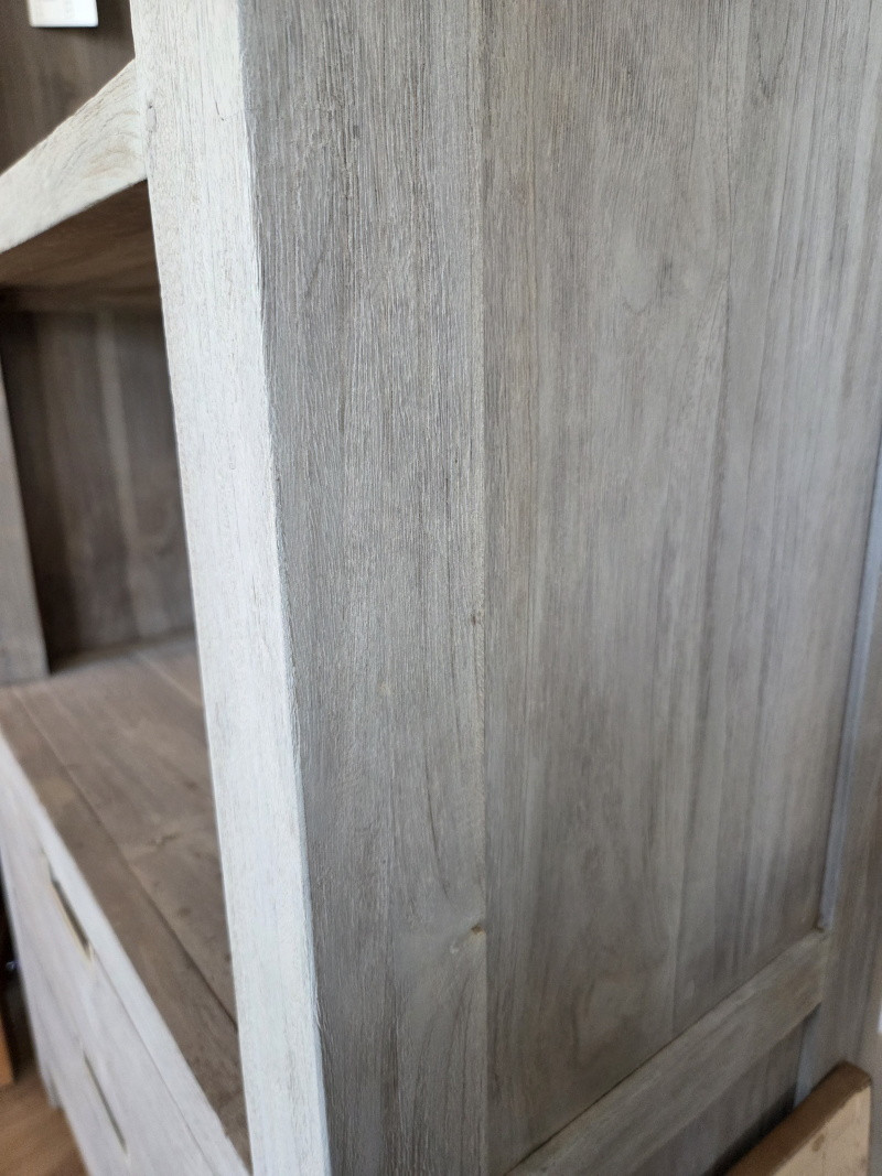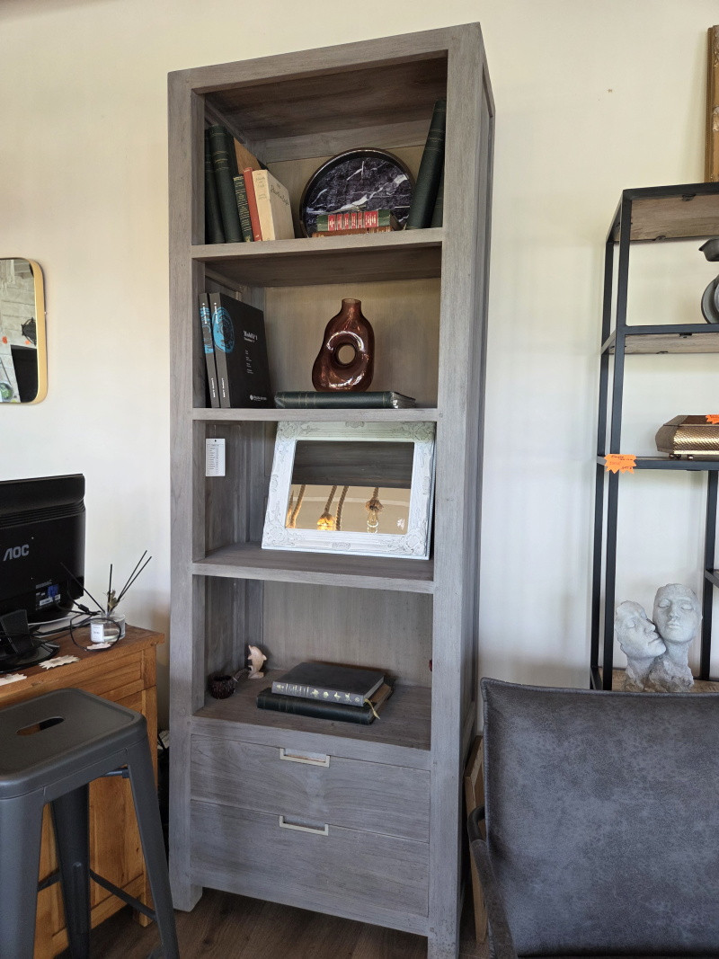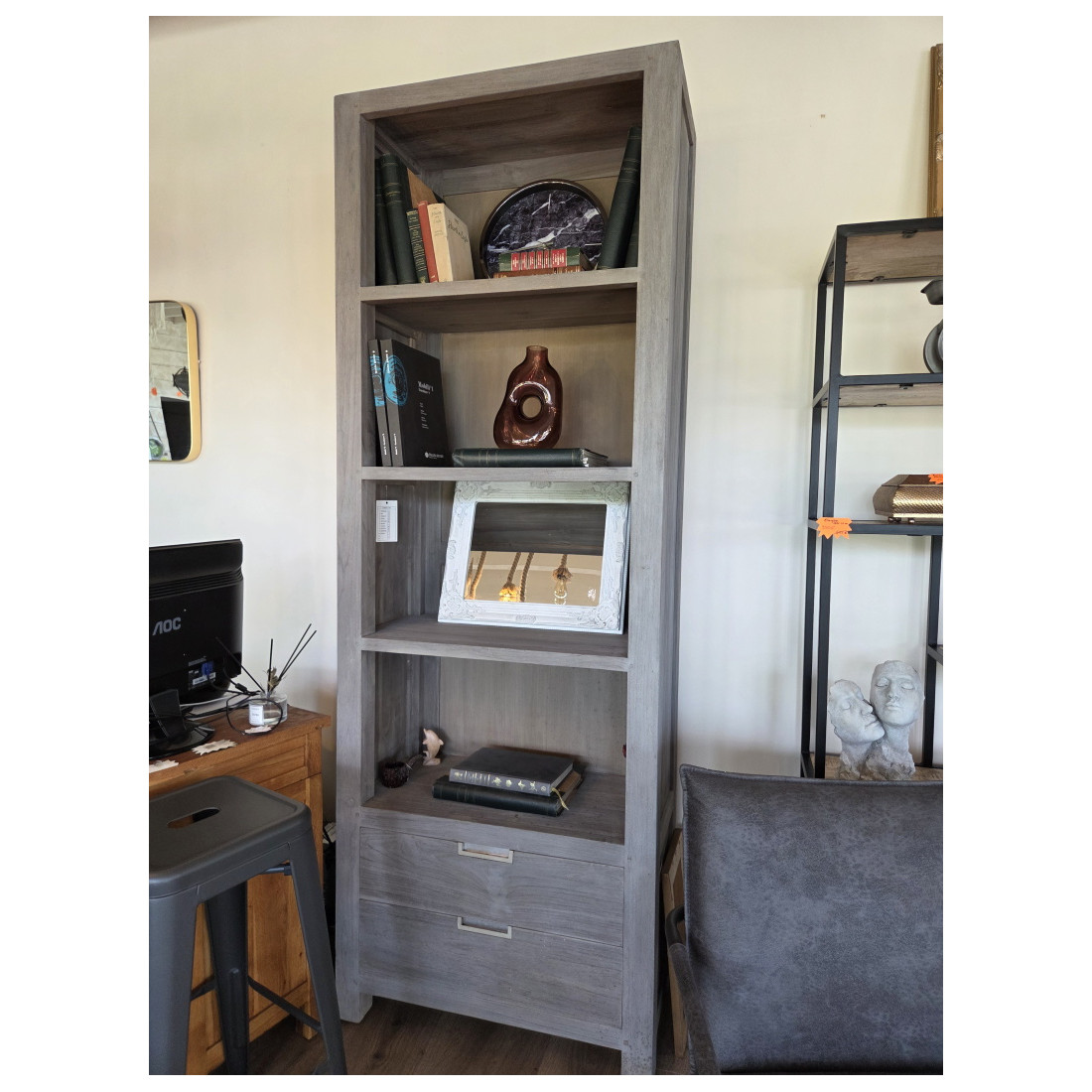 Cette bibliothèque fabriquée en bois massif de teck recyclé, est composée de 3 étagères et de 2 tiroirs en partie basse. Vous aimerez son design simple et sa finition grisée.