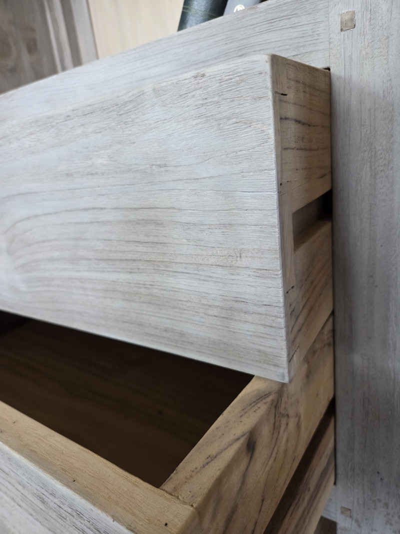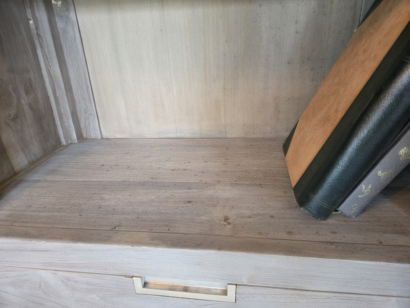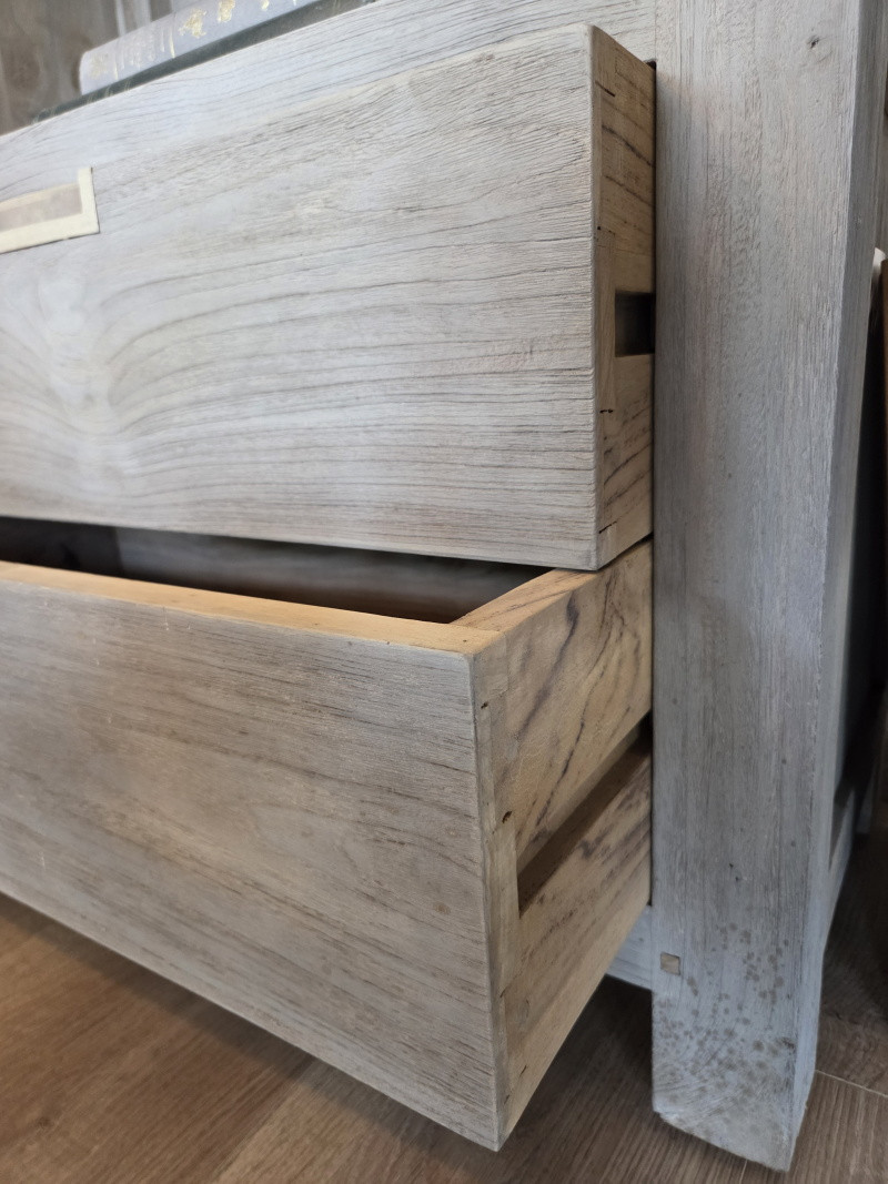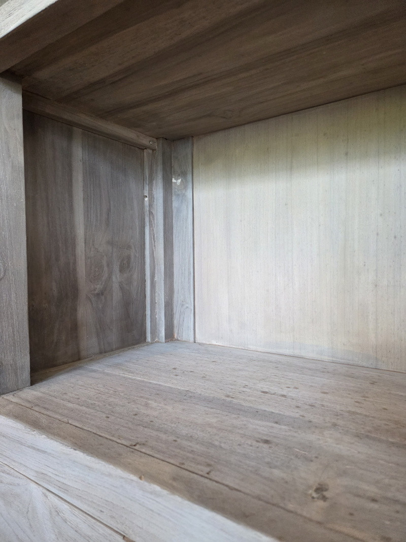 Cette bibliothèque fabriquée en bois massif de teck recyclé, est composée de 3 étagères et de 2 tiroirs en partie basse. Vous aimerez son design simple et sa finition grisée.