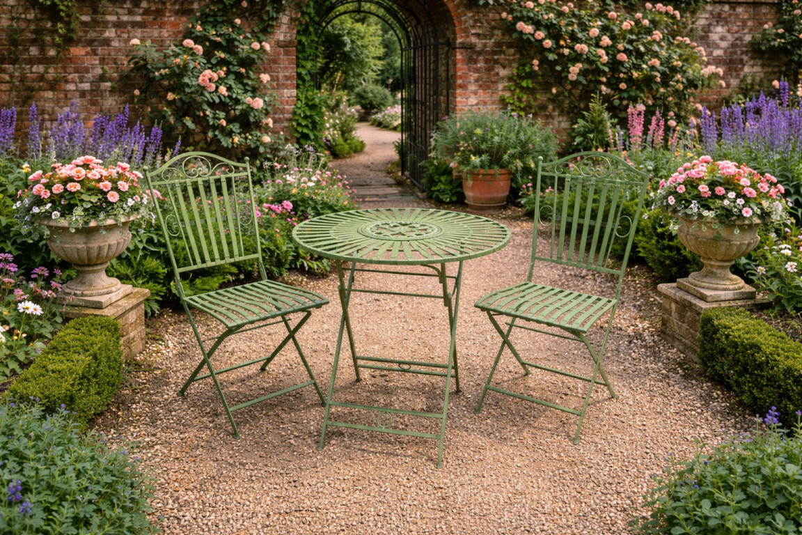 Design tout en clayette pour cet ensemble en métal, composé d'une table ronde et de deux chaises. Des volutes en haut des chaises et un joli motif au centre de la table égaient le tout. Sa finition vert antique se mariera à merveille à la verdure de votre jardin.