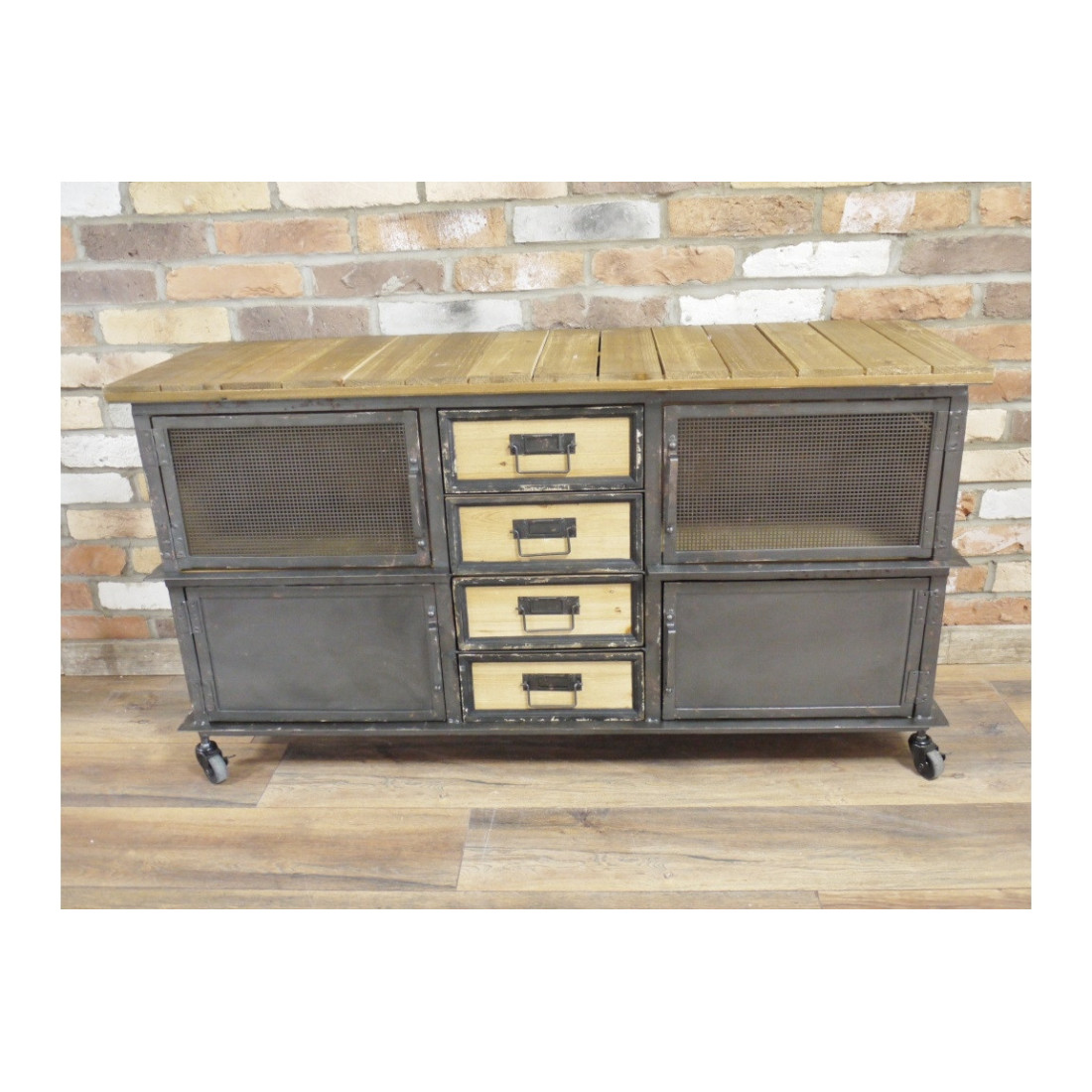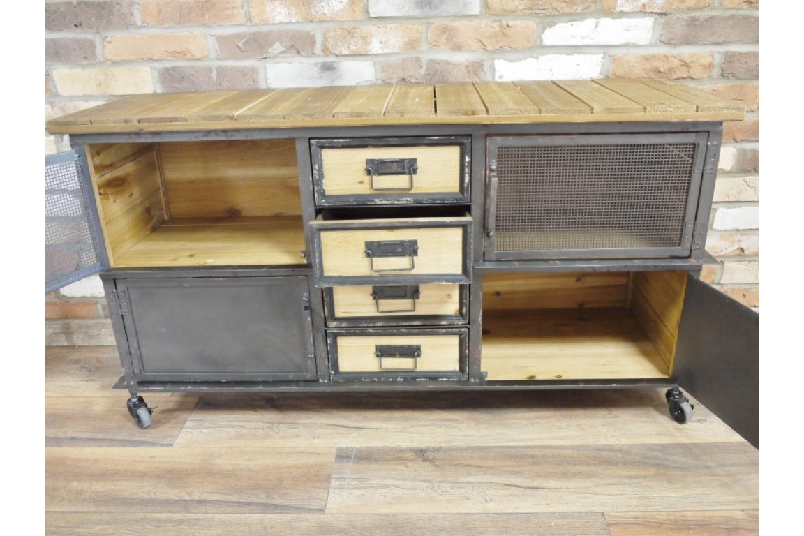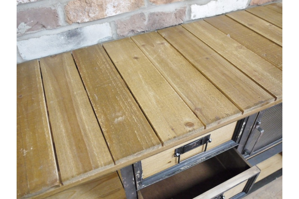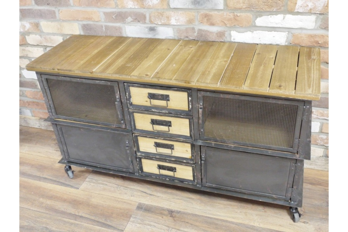 Avec un look plutôt industriel, ce meuble bas vous offre beaucoup d'espaces de rangements avec ses 4 tiroirs aux façades de bois naturel mais aussi derrière ses 4 portes quelles soit griallagées ou en métal plein.