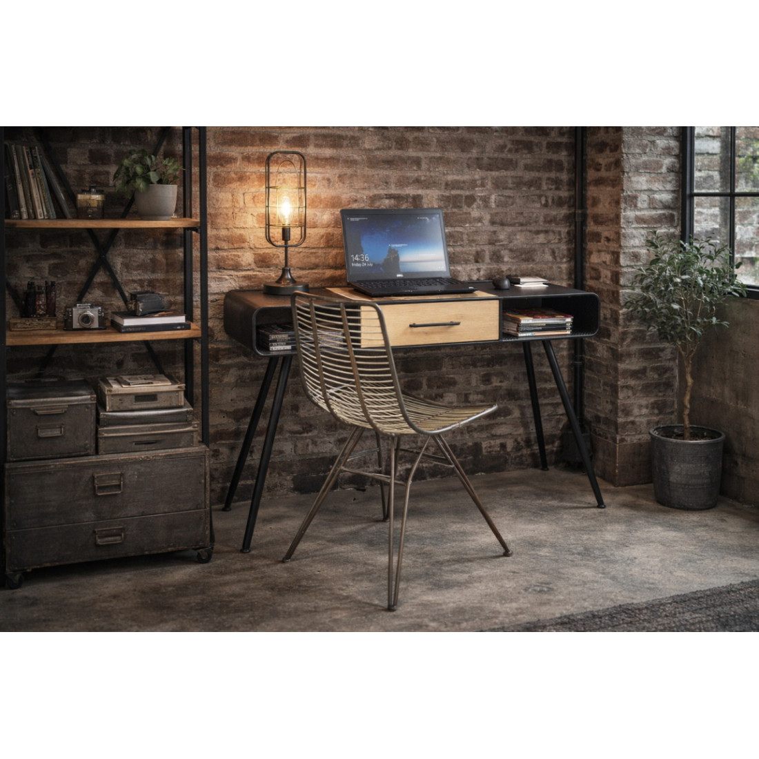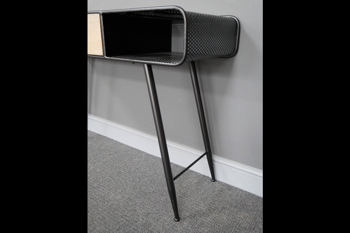 Le style indus et à la fois rétro avec ce bureau métallique ajouré et son tiroir en bois de pin. Pratique et peu encombrant, ce bureau aux nombreux rangements (niches, tiroir..) ira aussi bien dans la pièce à vivre, dans la chambre mais aussi dans le hall d'entrée de votre maison.