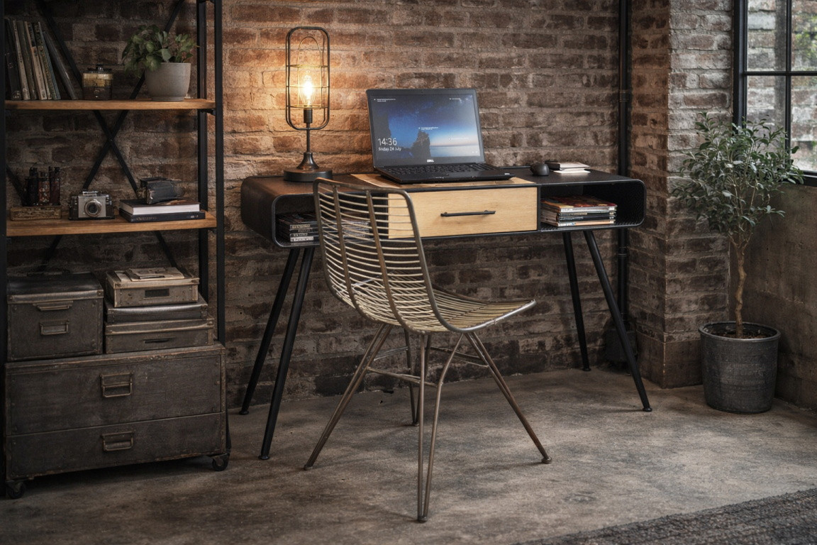 Bureau indus en métal et bois de pin avec tiroir