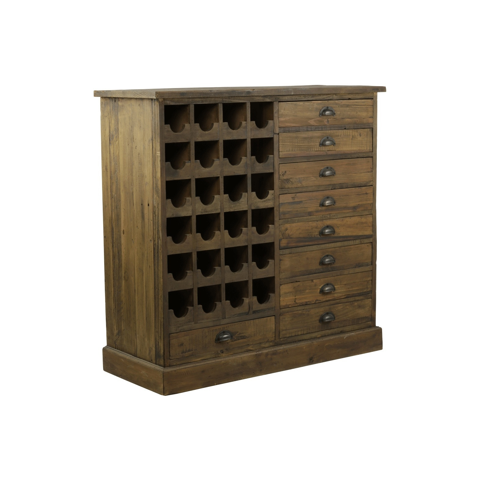 Comptant 24 casiers à bouteille, ce buffet en bois vieilli pourrait presque faire office de meuble bar. Plein du charme des décennies passées, il garde vos précieuses bouteilles à portée de main et donne envie de partager un moment convivial entre amateurs de bonnes choses. Les nombreux tiroirs vous permettent également de l’utiliser comme semainier afin d’y ranger de nombreuses petites affaires courantes. Un beau meuble authentique, tant par le style que ses matériaux !