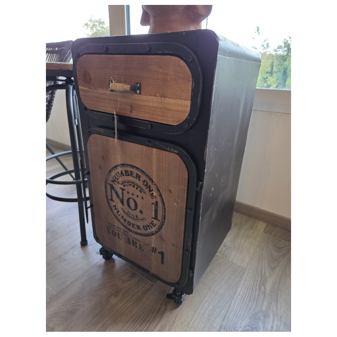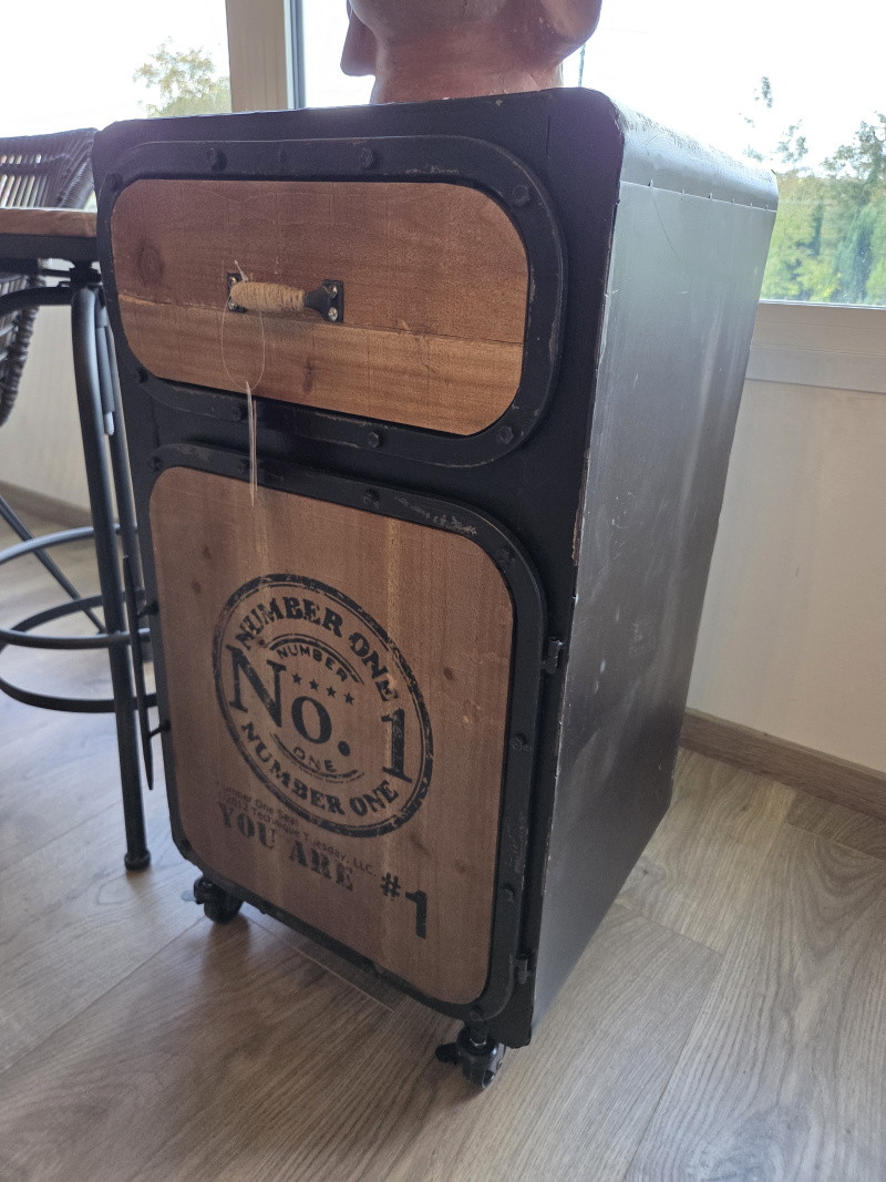 Une table de chevet très originale entièrement conçue en métal brossé et bois. De style purement industriel elle dispose d'un tiroir et d'une porte en partie basse pour y ranger vos affaires personnelles et afin de les avoir à portée de main une fois au lit.