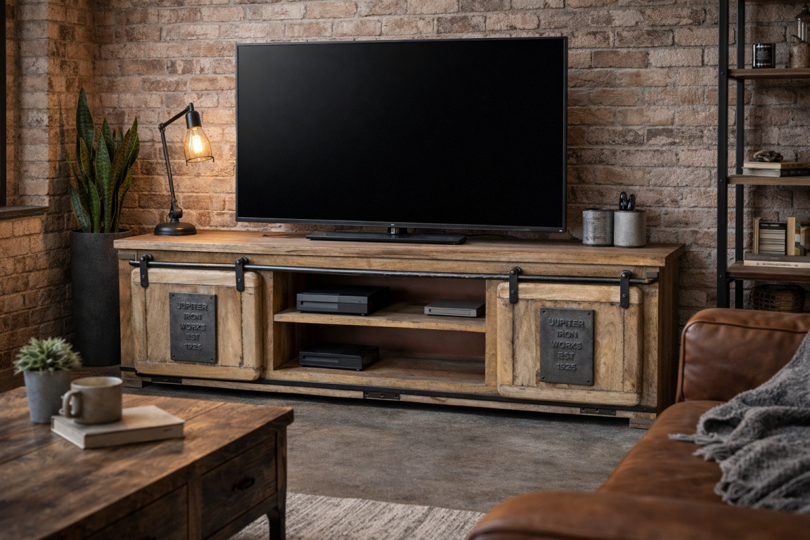 Les portes coulissantes sont en effet un choix contemporain, tandis que le système de coulisses et de rail apparents s’inscrit clairement dans le style industriel. Enfin, le manguier apporte au meuble la touche haut de gamme qui convient à un salon meublé avec goût.