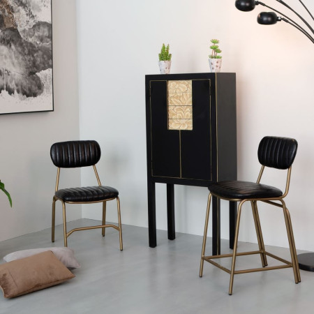 Les qualités de cette chaise de bar sont le confort et l'esthétique avec son métal doré pour le piètement et le cuir synthétique noir pour l'assise et le dossier. Cette chaise haute sera paraite dans un intérieur au style moderne ou rétro !