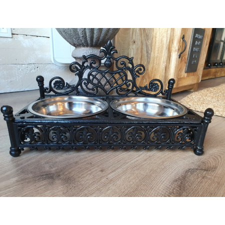 Apportez de l'originalité à votre décoration grâce à ce support pour gamelles pour votre animal de compagnie au look baroque. Réalisé en fonte pour le support, les gamelles sont en inox.
