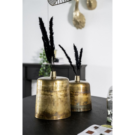 Ce magnifique vase en métal doré effet vieilli et aux formes géographiques innovantes sera la pièce maîtresse en terme de design dans votre intérieur. Seul, il constitue un élément de décoration élégant pour tous les espaces de votre maison. Vous pourrez également lui rajouter quelques feuilles ou fleurs de pampas séchées.