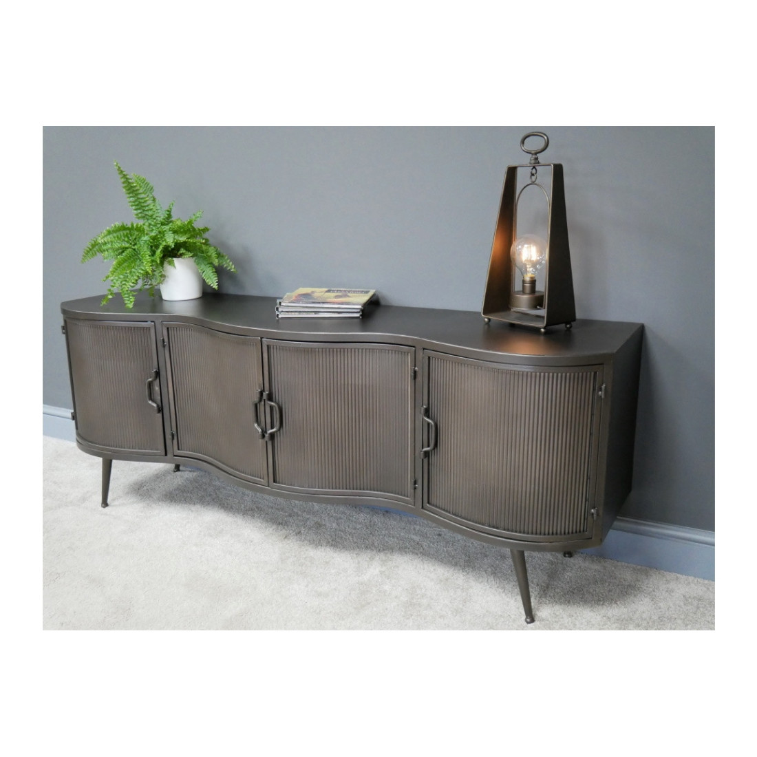 Réalisé entièrement en métal brossé, ce buffet bas de 150 cm de long vous offre beaucoup d'espace de rangements grâce à ses 4 portes aux façades ondulées très originales. Les 2 portes centrales de ce buffet vous permettront d'y stocker beaucoup d'affaires, notamment de grands objets puisqu'elles s'ouvrent entièrement sur la quasi moitiée du meuble.