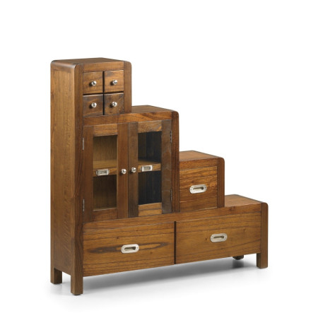Ce petit meuble d’appoint doté de 7 tiroirs et d'une petite vitrine 2 portes viendra décorer votre coin sous l'escalier tout en vous offrant un réel espace de rangement. Les poignées en laiton de couleur argent viennent sublimer ce bois massif vernis aux couleurs marrons avec des reflets naturels que ne font que venir sublimer ce magnifique meuble escalier.