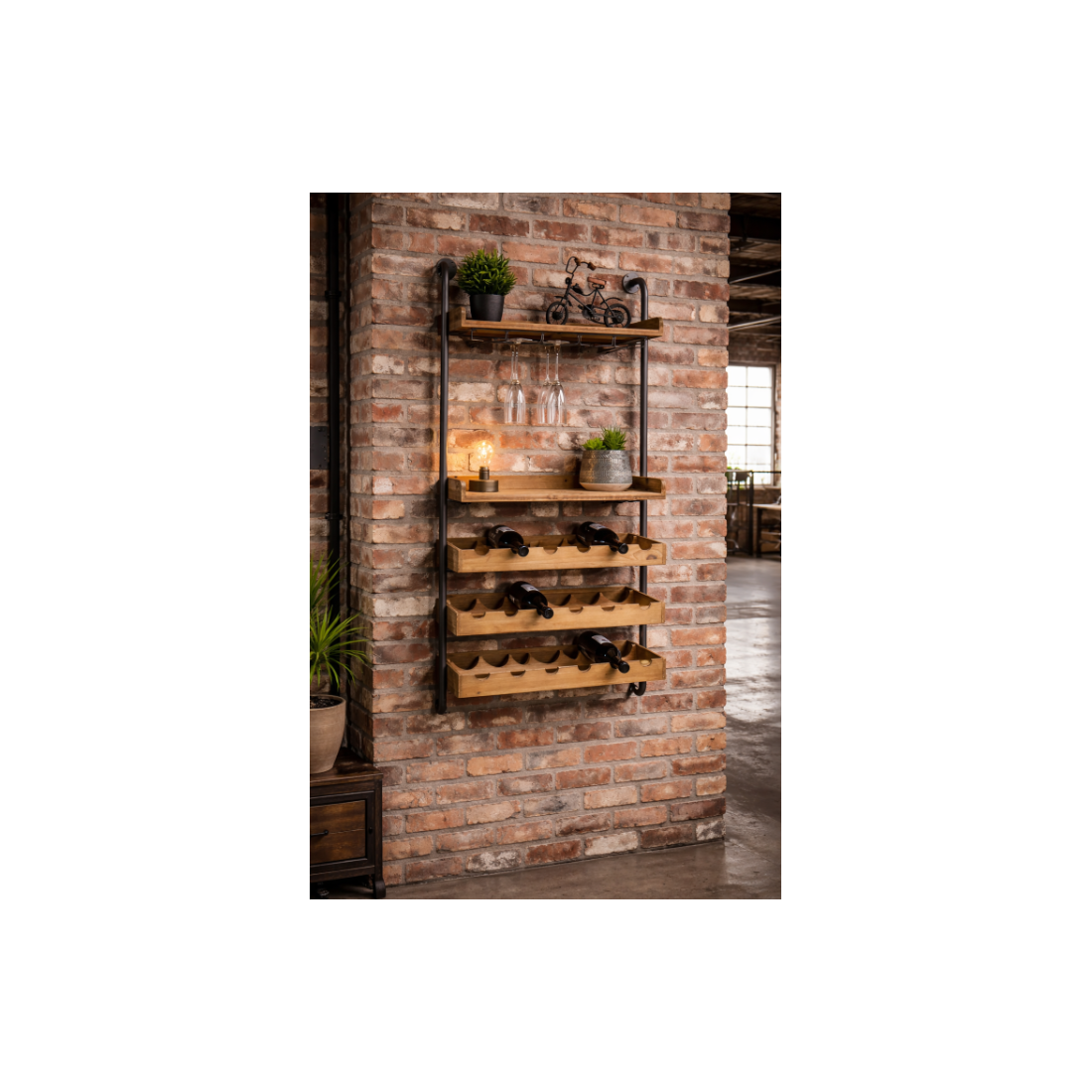 Mettez en avant vos plus grands crus sur cette étagère murale style industriel qui pourra accueillir jusqu'à 18 bouteilles. Sous l'étagère du haut un rack à verres vous permettra de mettre en valeur vos flûtes à champagne et verres à pied.
