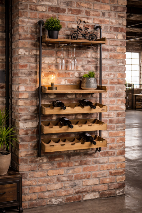 Les compartiments à bouteilles et les étagères sont fabriquées en bois de pin naturel avec un aspect assez brut pour un effet authentique. De chaque côté, des barres de fixations métalliques viennent compléter l'ensemble et apporter cette touche industrielle tant appréciée dans nos décorations d'intérieur.