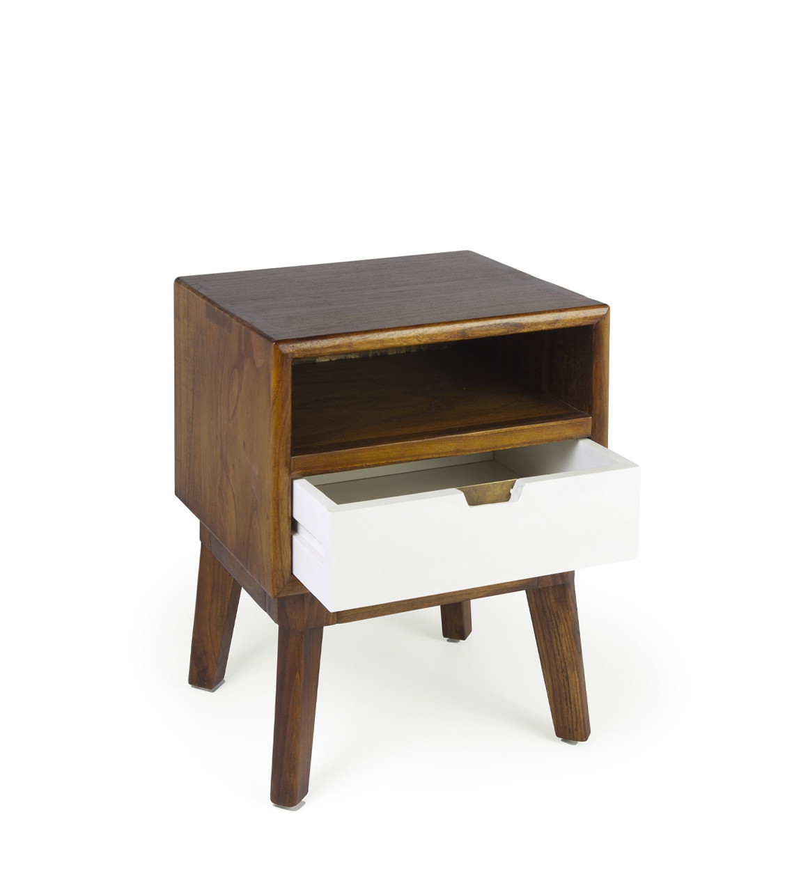 Voici une table de chevet très pratique, de style rétro tout à fait dans l'air du temps. Elle est entièrement réalisée en bois massif de mindi et dispose d'une niche de rangement ainsi que d'un tiroir à la façade blanche et aux détails dorés au niveau de sa poignée. Cossue, elle réchauffera votre chambre à coucher et lui apportera beaucoup de style.