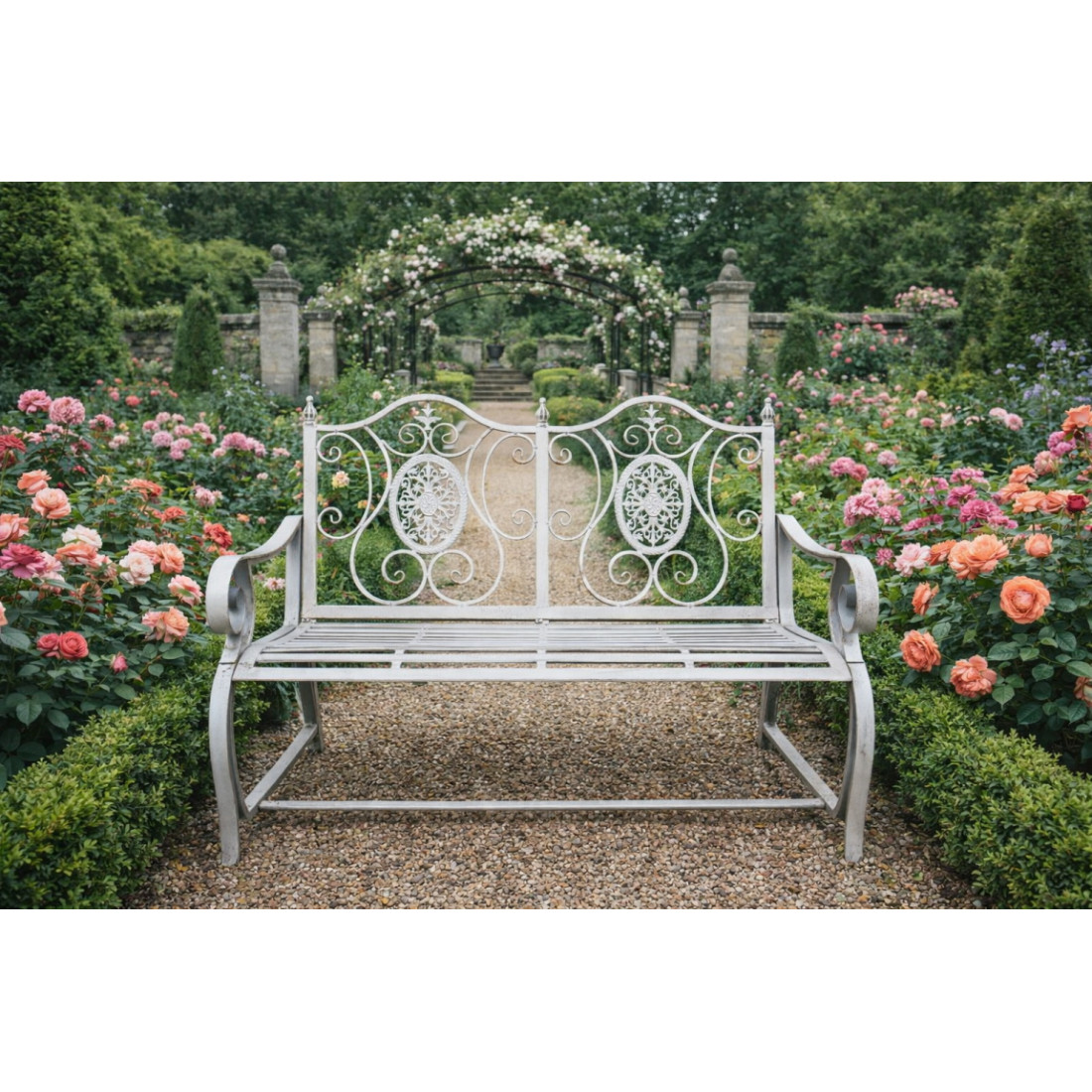 Conçu en métal et recouvert d'une patine grise avec un effet vieilli pour plus de charme, ce joli banc deux places sera également très décoratif dans votre jardin ou terrasse.