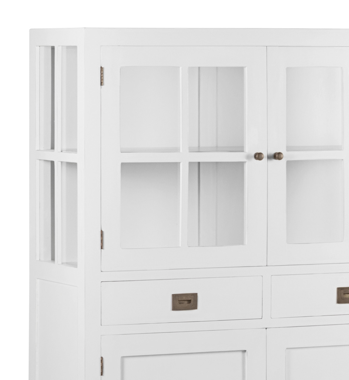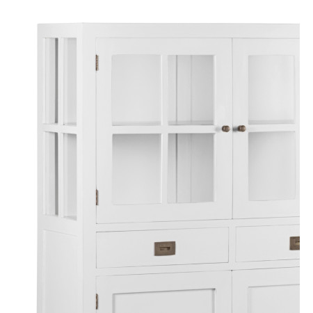 Découvrez cette belle vitrine entièrement réalisée en bois de mindi massif et fabriquée à la main. De qualité parfaite, cette vitrine offre pas mal d'atouts très appréciables avec ses petits accessoires en bronzes, des petits détails qui font tout de même la différence. Elle se compose de quatre larges portes qui pourra laisser entrevoir votre belle vaisselle en partie haute du meuble grâce à ses portes vitrées. Vous retrouvez en partie basses deux larges étagères qui offrent un espace considérable au rangement. Enfin au centre du meuble deux tiroirs sont à disposition afin d'y ranger quelques ustensiles ou vos affaires personnelles par exemple.