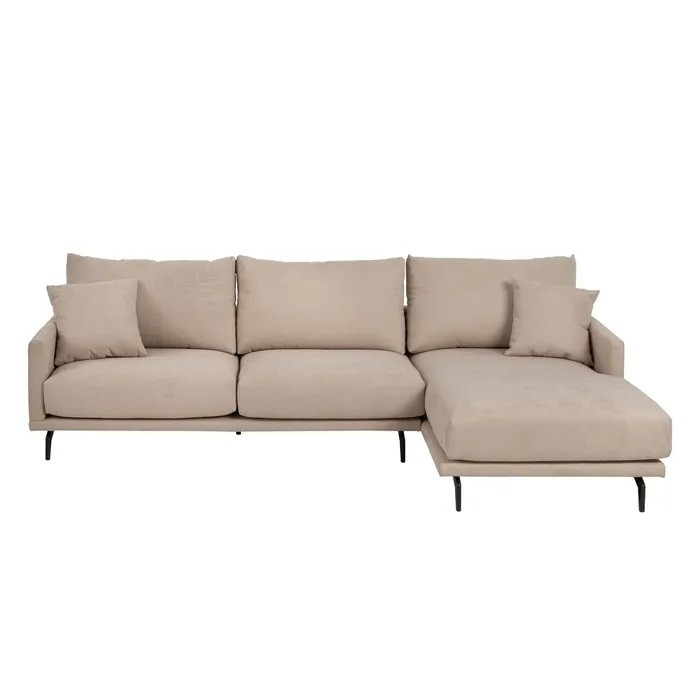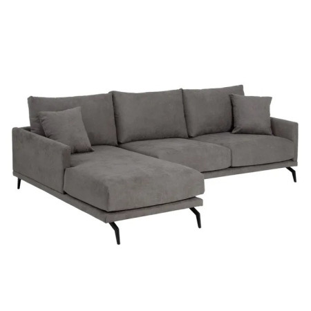 Le piètement métal allège la silhouette de ce canapé d'angle en tissu et apporte une note de modernité à l’allure contemporaine et intemporelle de ce grand canapé avec méridienne.