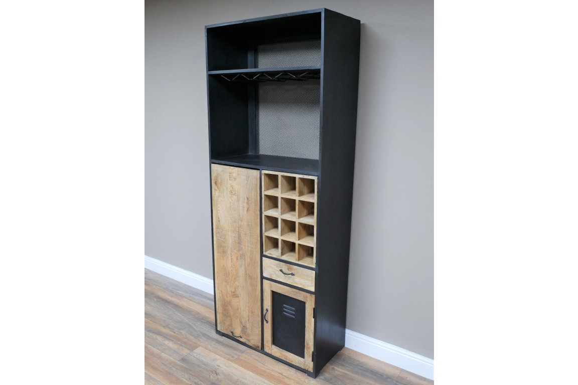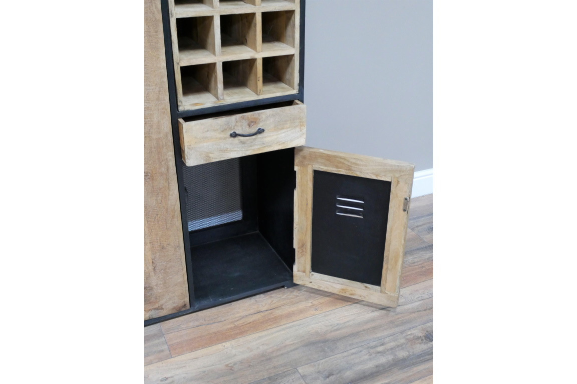 Toute en hauteur et pas trop large, cette armoire modulable de bar sera idéale pour les petits appartements et donc facile à loger dans la cuisine ou dans votre pièce à vivre. Elle n'en reste pas moins très esthétique et décorative avec ce mélange de matériaux tels que le métal noir, le bois naturel et brut du manguier sans oublier le grillage que vous apercevez sur le fonds de ce magnifique meuble.