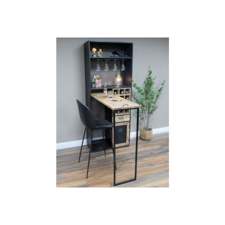 Un meuble très original et vraiment pratique !! Deux en un, cette armoire bar servira non seulement à ranger vos bouteilles de vin et vos verres à pieds, mais également de table haute pour vos petits déjeuners ou pour servir l'apéritif à vos invités. En dépliant la grande tablette en bois massif de manguier, vous obtenez donc une table de bar qui fera aussi office de comptoir.