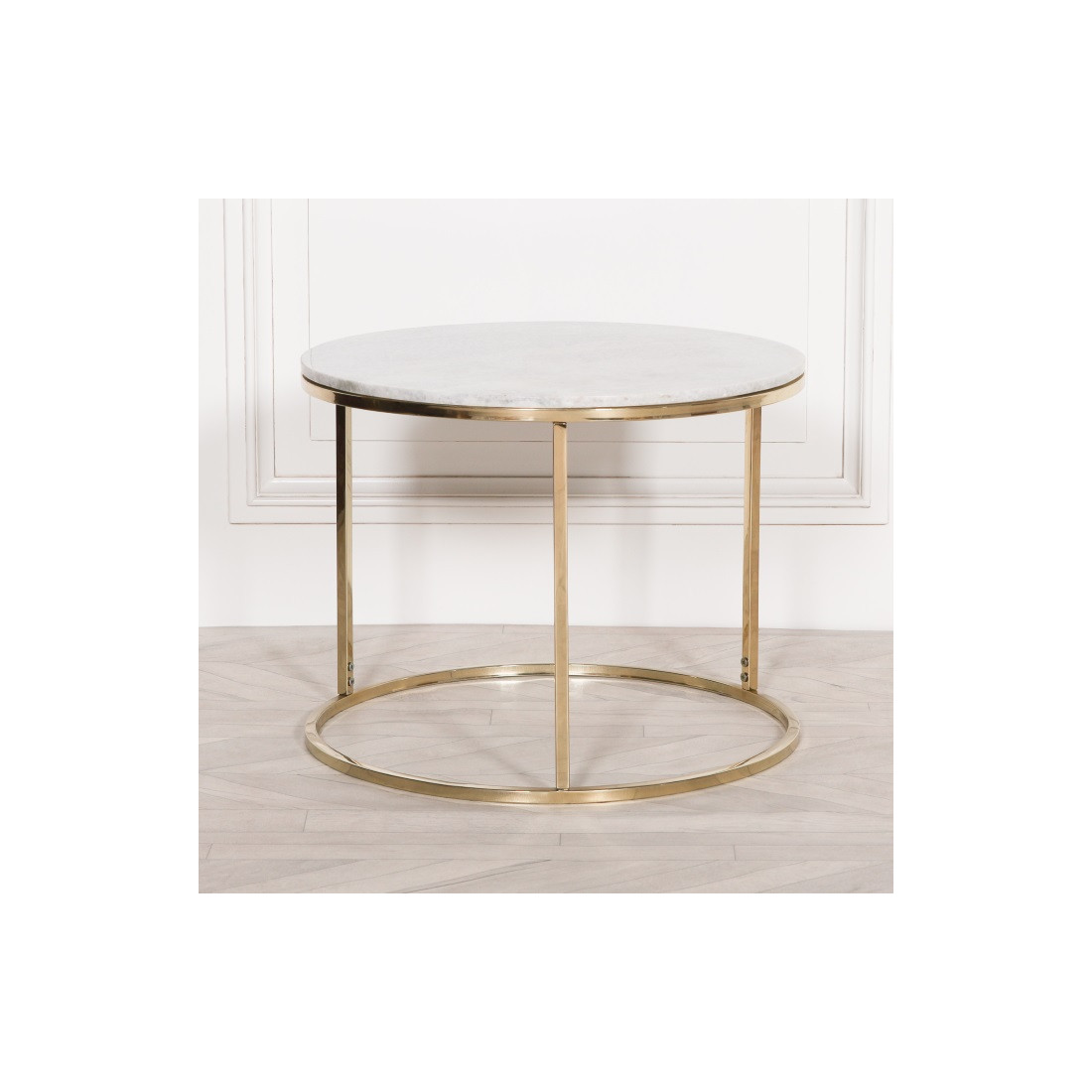 Une table basse très tendance avec des matériaux de qualité, tels que le marbre blanc pour le plateau et le métal couleur or pour son piètement.