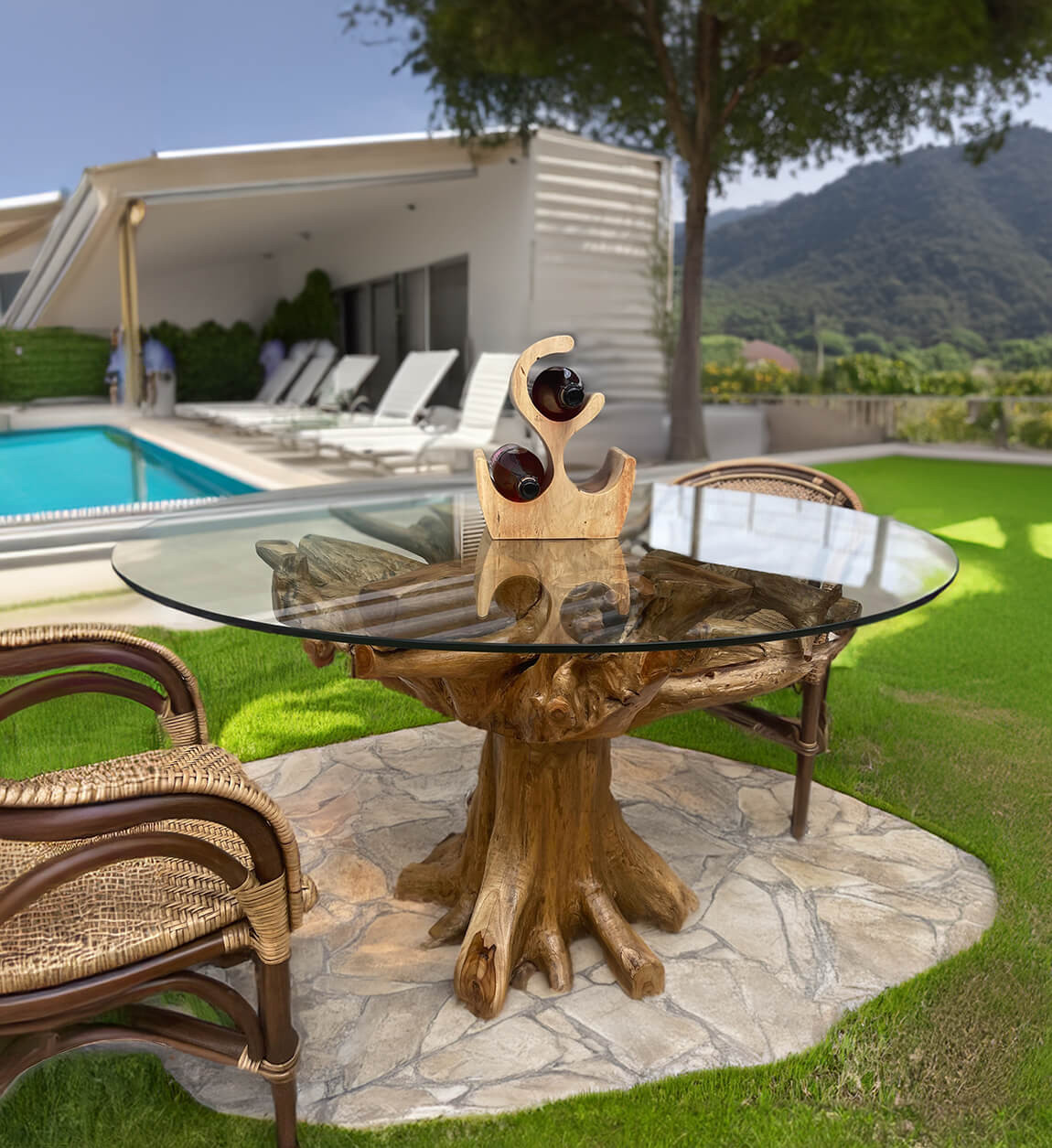 Cette table au plateau en verre et pied en forme de racines de teck sera une pièce maîtresse dans votre décoration d'intérieur. Veuillez noter que le pied de cette table étant en racine de teck, très naturelle, chaque modèle de table sera donc unique et certaines variations pourront être notées. Table disponible en deux dimensions, diamètre 130 cm et diamètre 150 cm.