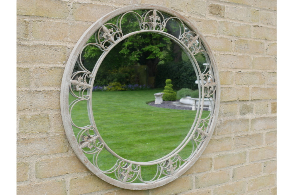 Ce grand miroir rond est proposé avec un diamètre de 70 cm. Réalisé en métal, et à la patine vieillie dans des tons de beige, crème et taupe il est orné de fleurs de lys dans son pourtour.
