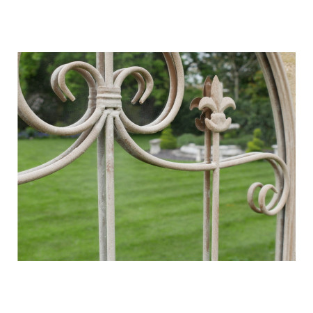 Ce miroir en forme de fenêtre est réalisé en métal et est ici proposé avec une patine antique dans des tons de beige, crème, taupe. Très décoratif, des ornements tels des fleurs de Lys viennent compléter ce beau miroir.