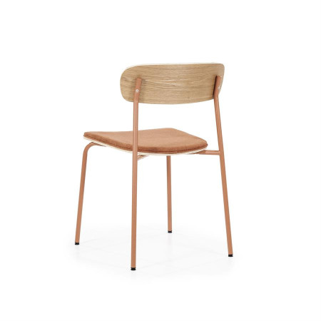 Cette chaise est disponible en 3 coloris, le beige, le taupe ou le terracotta. Chaque chaise a le même coloris au niveau de l'assise et des pieds. Par exemple, la chaise beige est proposée avec son assise en tissu beige et ses pieds dans les mêmes tons crème/beige, pour la chaise terracotta l'assise est en tissu terracotta ainsi que le métal de ses pieds, etc...