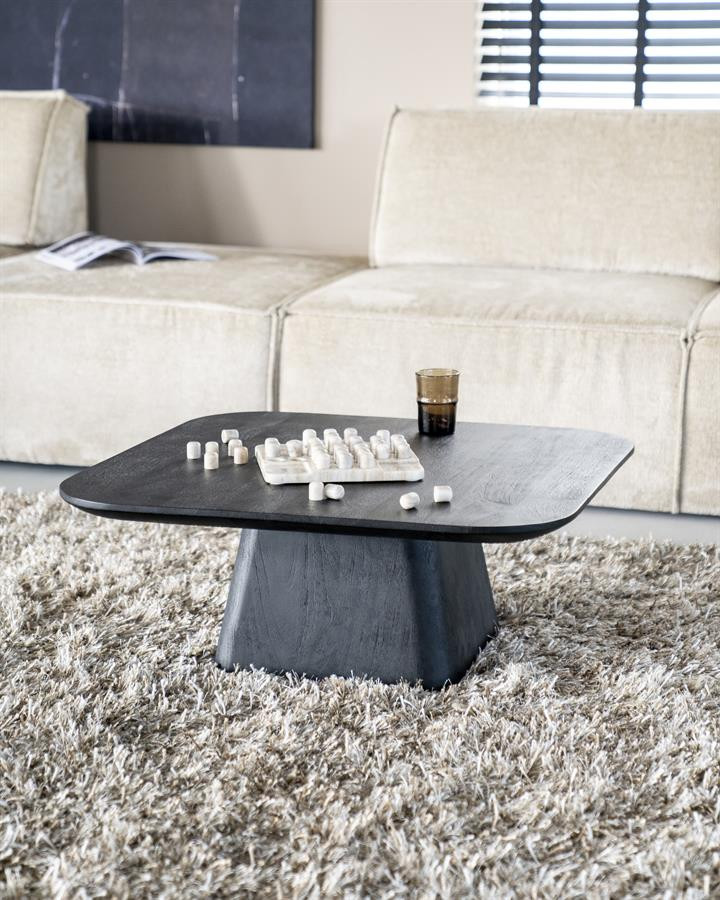 Avec son plateau carré aux bouts arrondis et son piètement en forme de trapèze, cette table basse de salon se révèle aussi chaleureuse que design et se prête idéalement à de grands moments de convivialité au cœur de votre maison. Le grand plateau en bois teinté avec ses 80 cm et soigneusement biseauté, souligne le côté haut de gamme de cette table basse carrée design tandis que les pieds épais constituent la touche indus et moderne qui permet au meuble de trouver aisément sa place dans différents genres de déco intérieure.