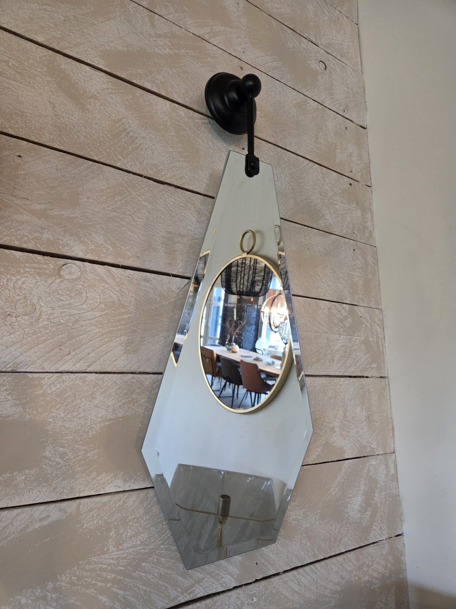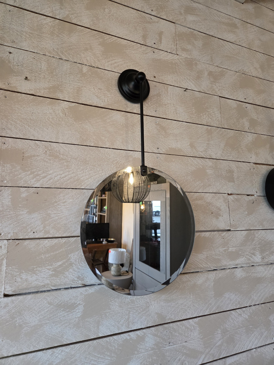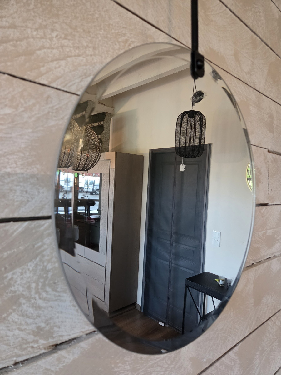 L'originalité de ce miroir se trouve dans sa patte de fixation métallique qui vient suspendre avec subtilité la glace ronde ou hexagonale. La finition biseautée du miroir apporter une touche chic à cet objet mural de décoration très tendance.