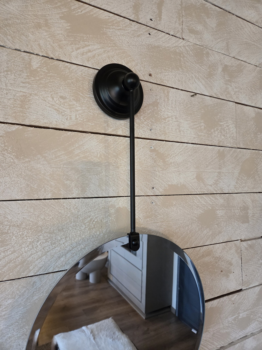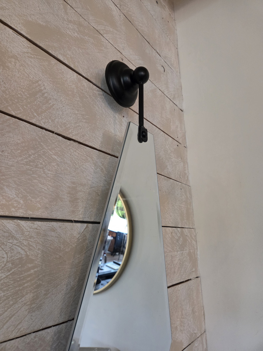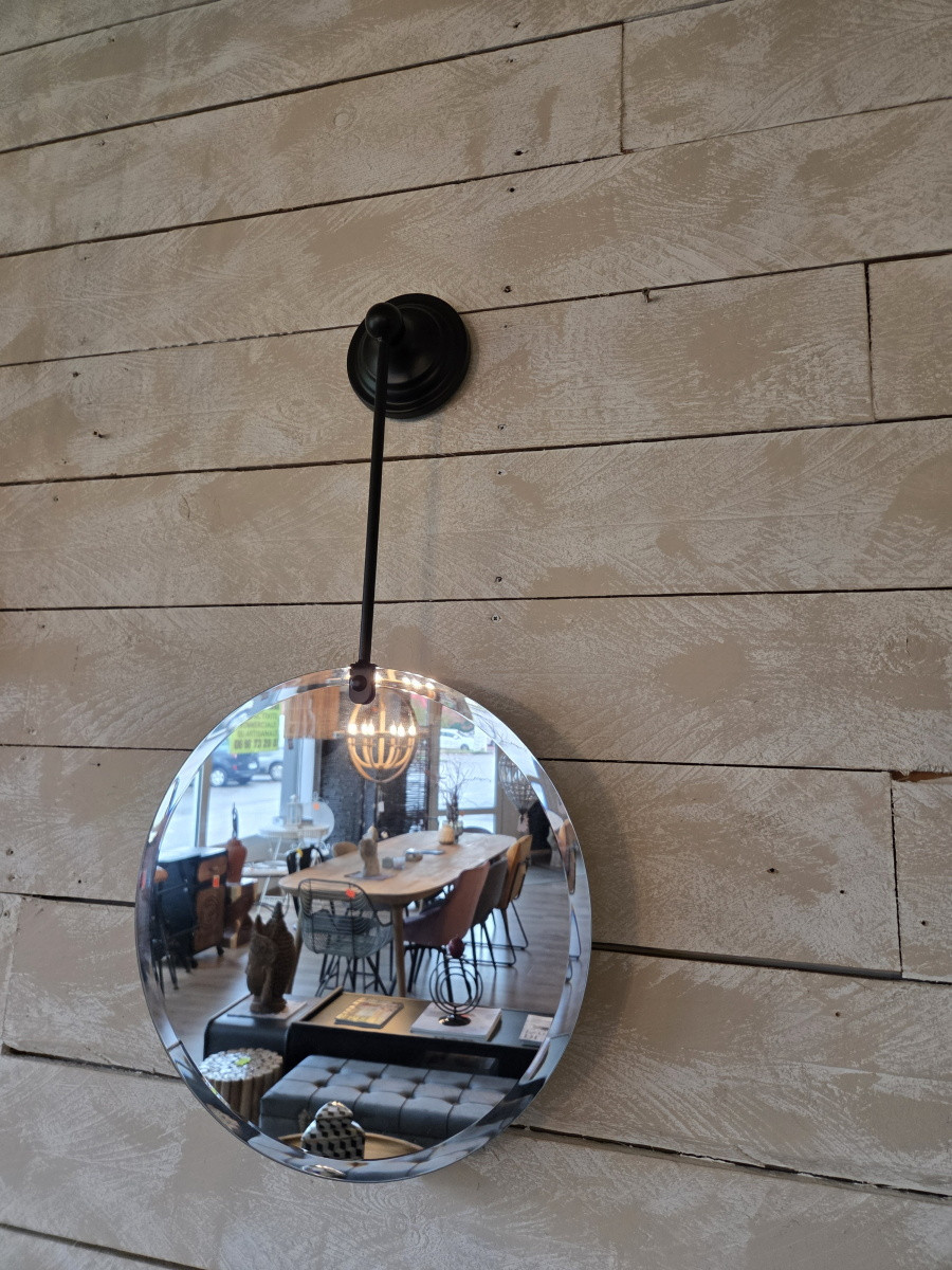 L'originalité de ce miroir se trouve dans sa patte de fixation métallique qui vient suspendre avec subtilité la glace ronde ou hexagonale. La finition biseautée du miroir apporter une touche chic à cet objet mural de décoration très tendance.