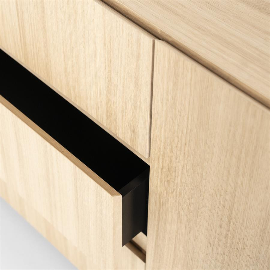 Moderne et minimaliste, ce buffet réalisé en chêne teinté clair vous offre de nombreux rangements derrière ses 3 portes et ses 3 tiroirs. Rectiligne et sans poignées apparentes, de style contemporain, il s'intègrera également dans un intérieur plus vintage.