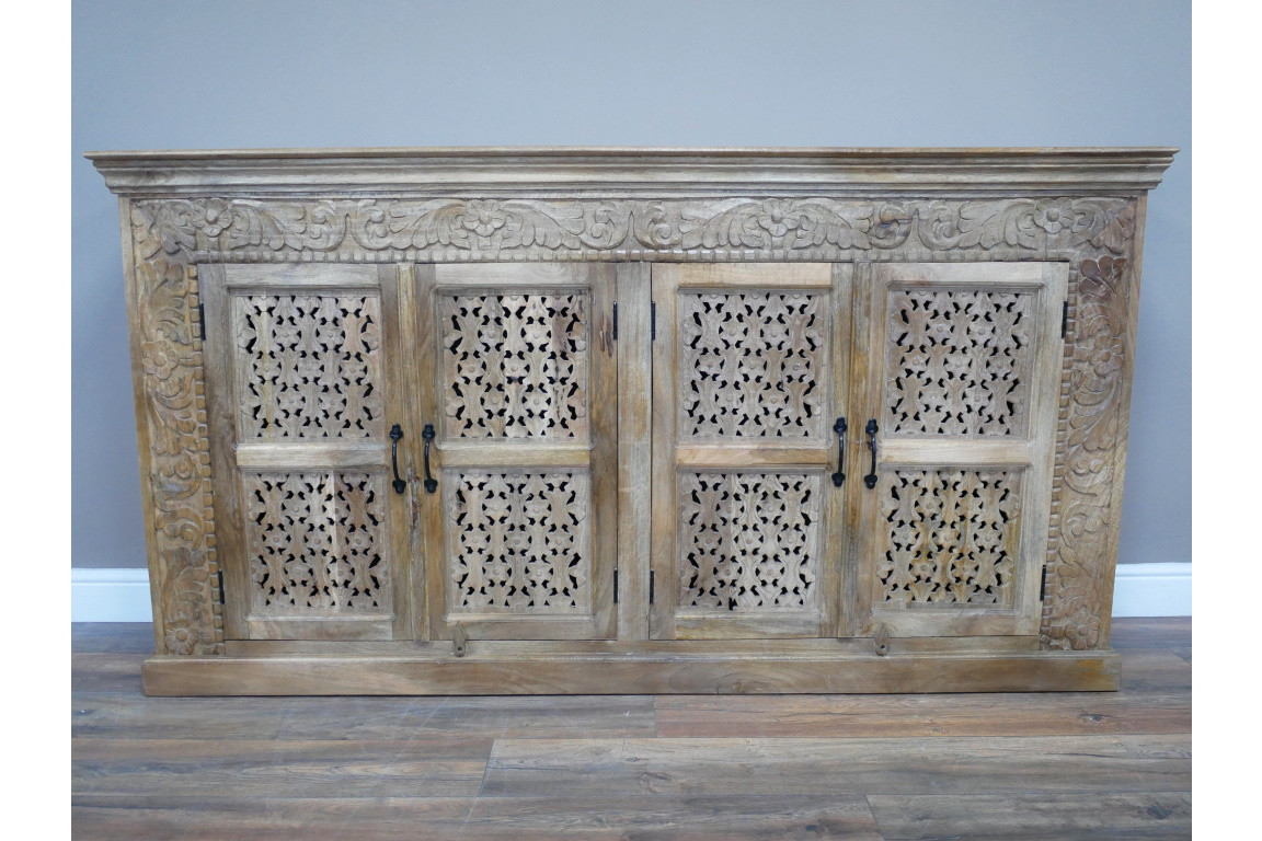 Cossu et raffiné, ce grand buffet 4 portes est réalisé en bois massif de manguier. Sa façade sculptée et ses portes ajourées en font un meuble unique et de qualité. Rappelant le style oriental vintage, ce large buffet en bois sera le bienvenu dans la cuisine comme dans la salle à manger pour y ranger votre vaisselle ou stocker vos conserves mais il trouvera également sa place dans un bureau pour organiser les documents hors de la vue de vos convives.