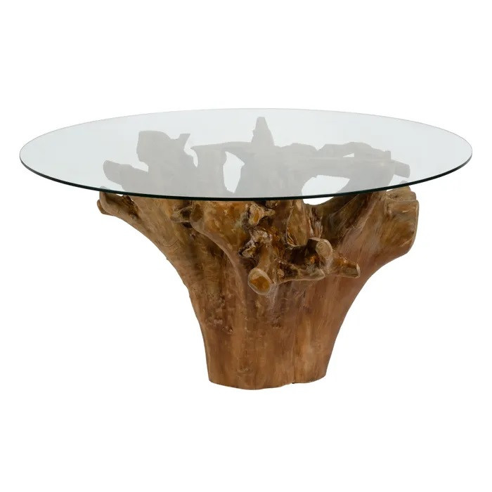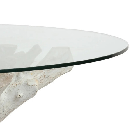 Grâce à son plateau rond en verre trempé, le piètement de cette magnifique table de repas est vraiment mis en valeur, que vous choisissiez le coloris blanchi ou la teinte naturelle du bois de teck. En effet, cette très belle table de repas au caractère fort apporte originalité à votre pièce de vie. Chaque table est unique de part son pied réalisé en racines de teck massif teinté ou blanchi.