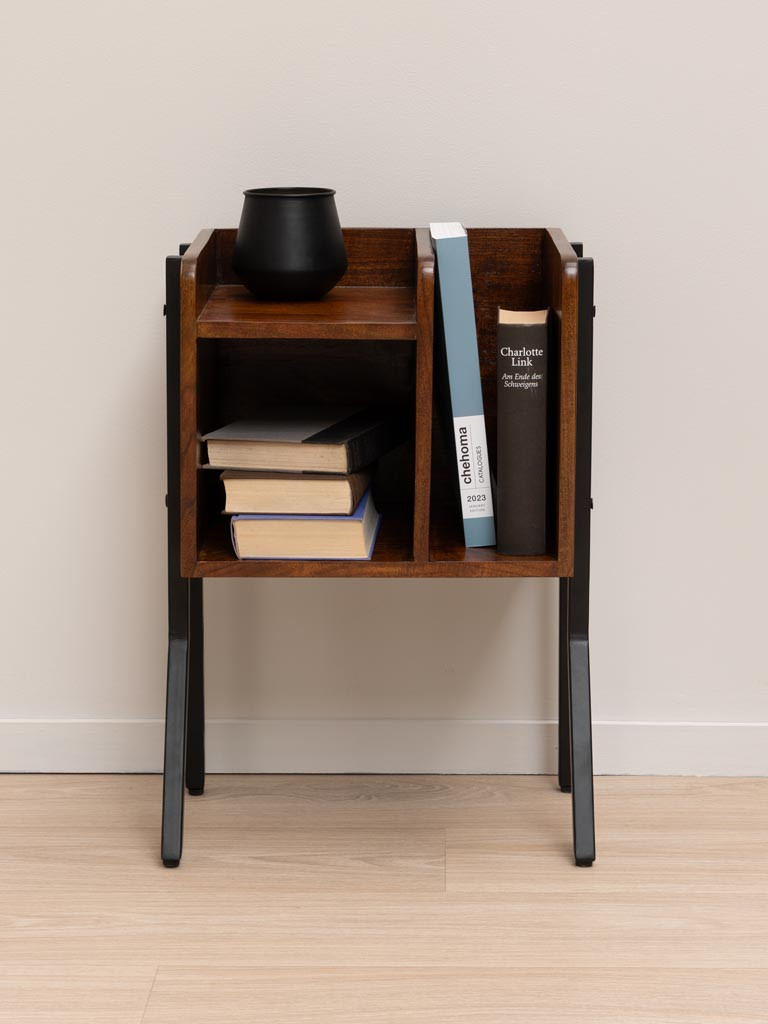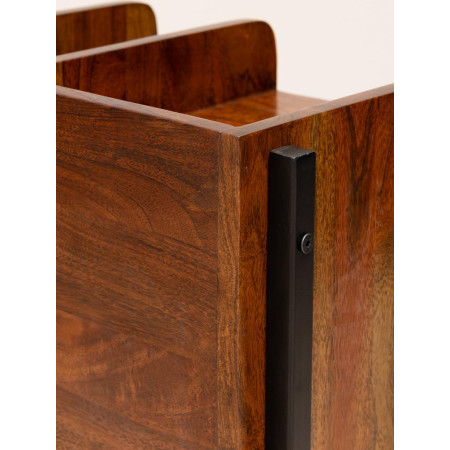 Le caisson réparti en plusieurs casiers est fabriqué en bois massif de manguier teinté marron auquel viennent se fixer des tubes métalliques noir en guise de pieds pour lui conférer un aspect plus moderne ou indus.