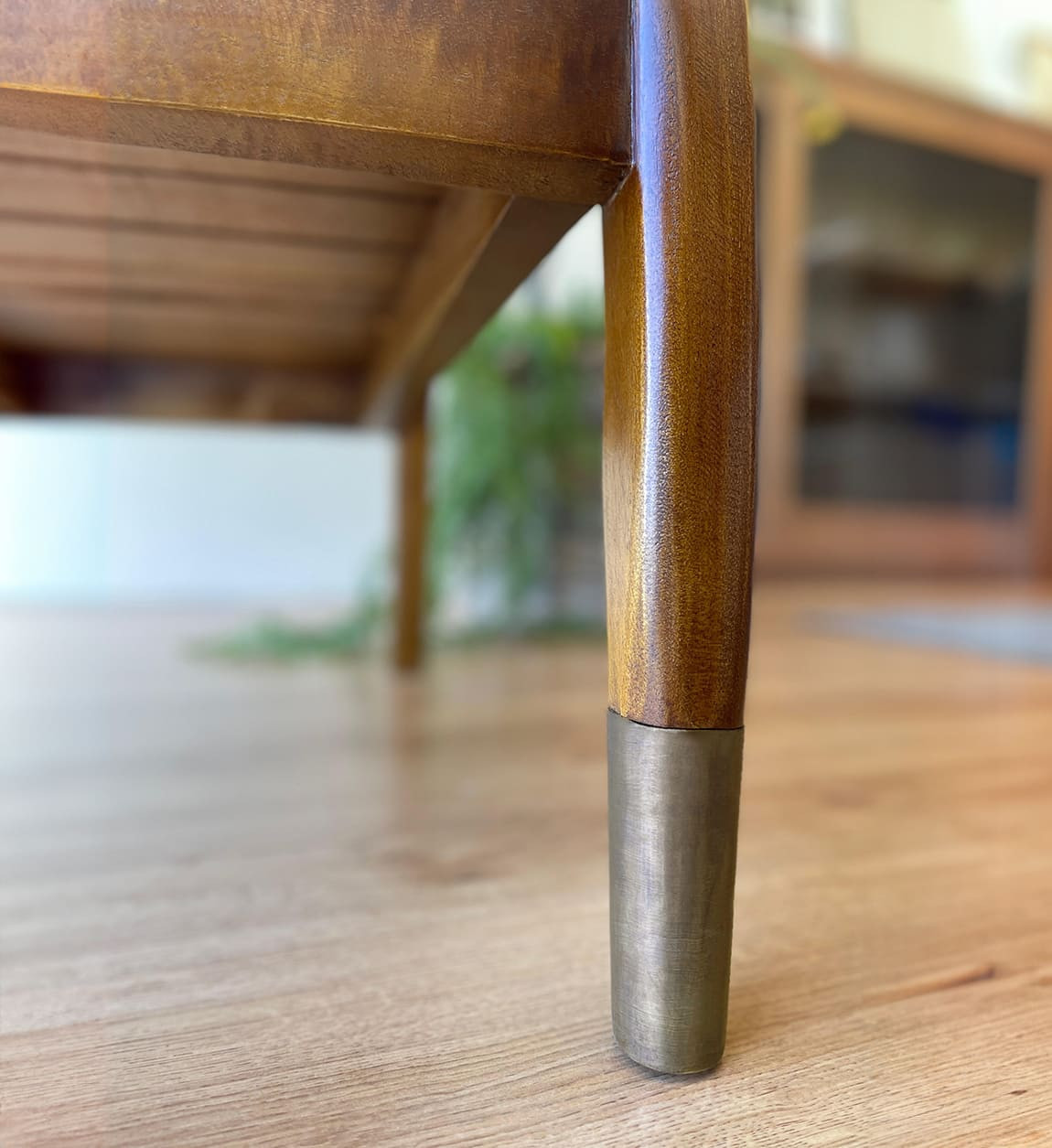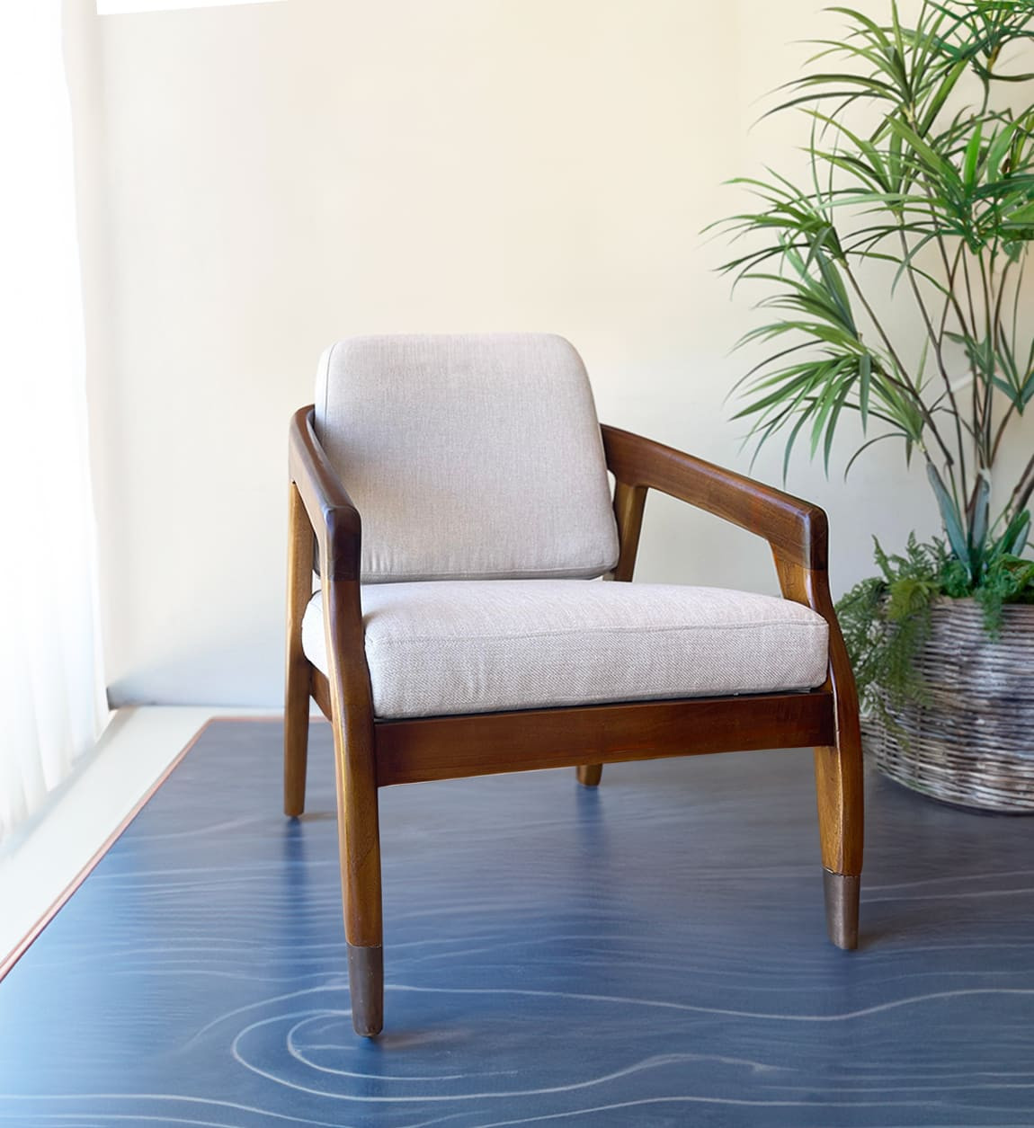 Design, élégant et très confortable, ce fauteuil bas avec ses coussins en tissu beige sera votre meilleur compagnon dans vos moments de détente. Idéal pour votre salon, dans le hall d'entrée ou dans la chambre, ce fauteuil bas est réalisé en bois massif de mindi teinté marron accompagné de son coussin d'assise et du dossier déhoussables. Vous remarquerez ses finitions impeccables que ce soit au niveau des accoudoirs comme des pieds avec ses détails métalliques couleur cuivre, ce qui ajoute une touche chic et sophistiquée à ce magnifique fauteuil de salon.