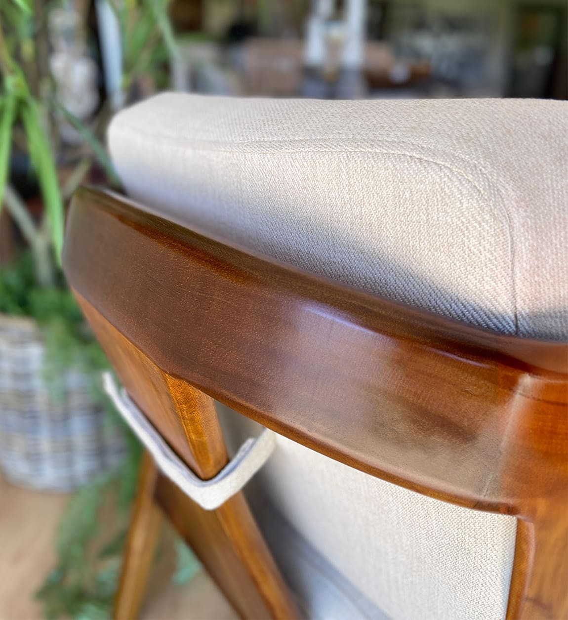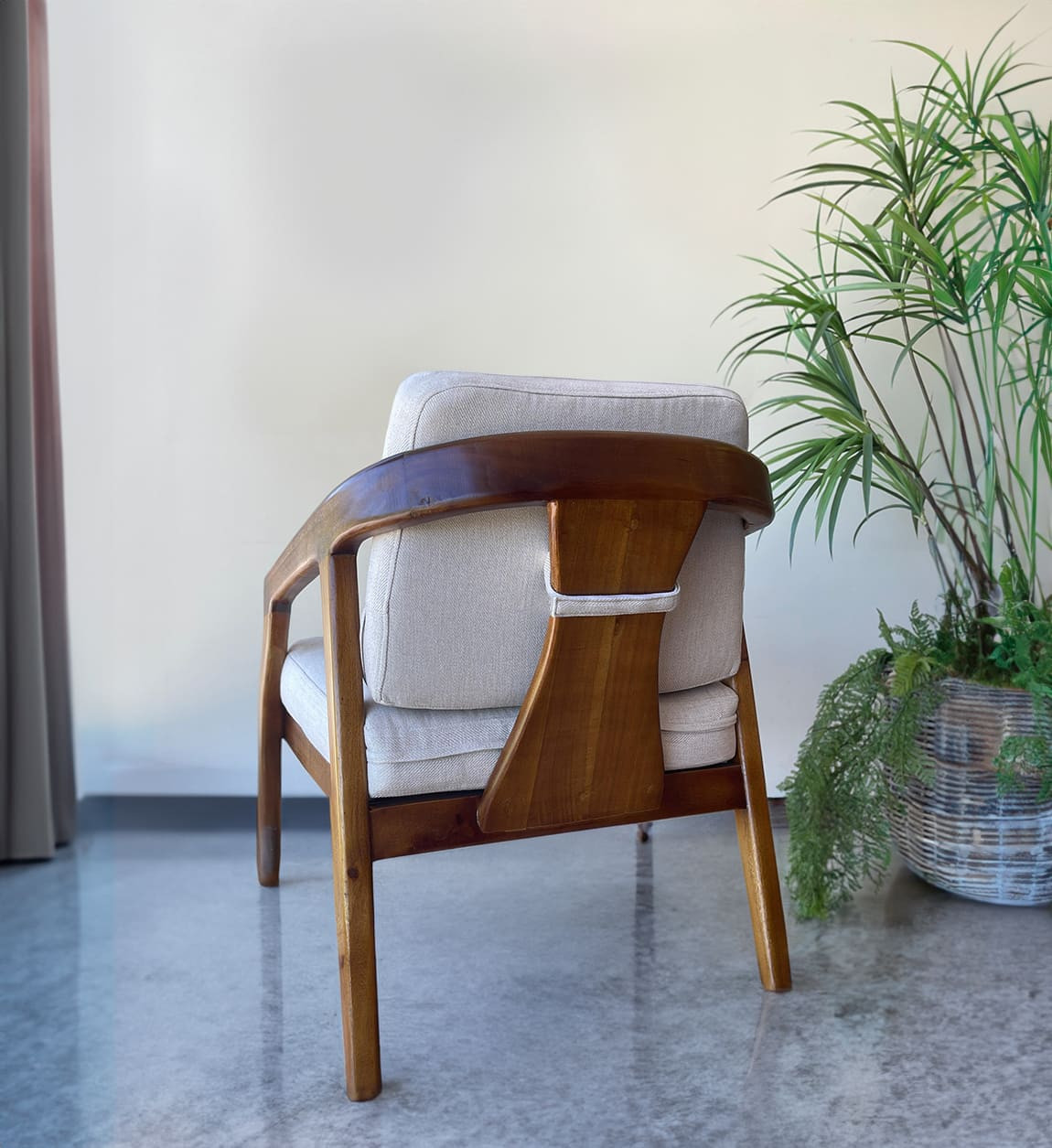 Fauteuil bas en bois massif et coussins tissu beige