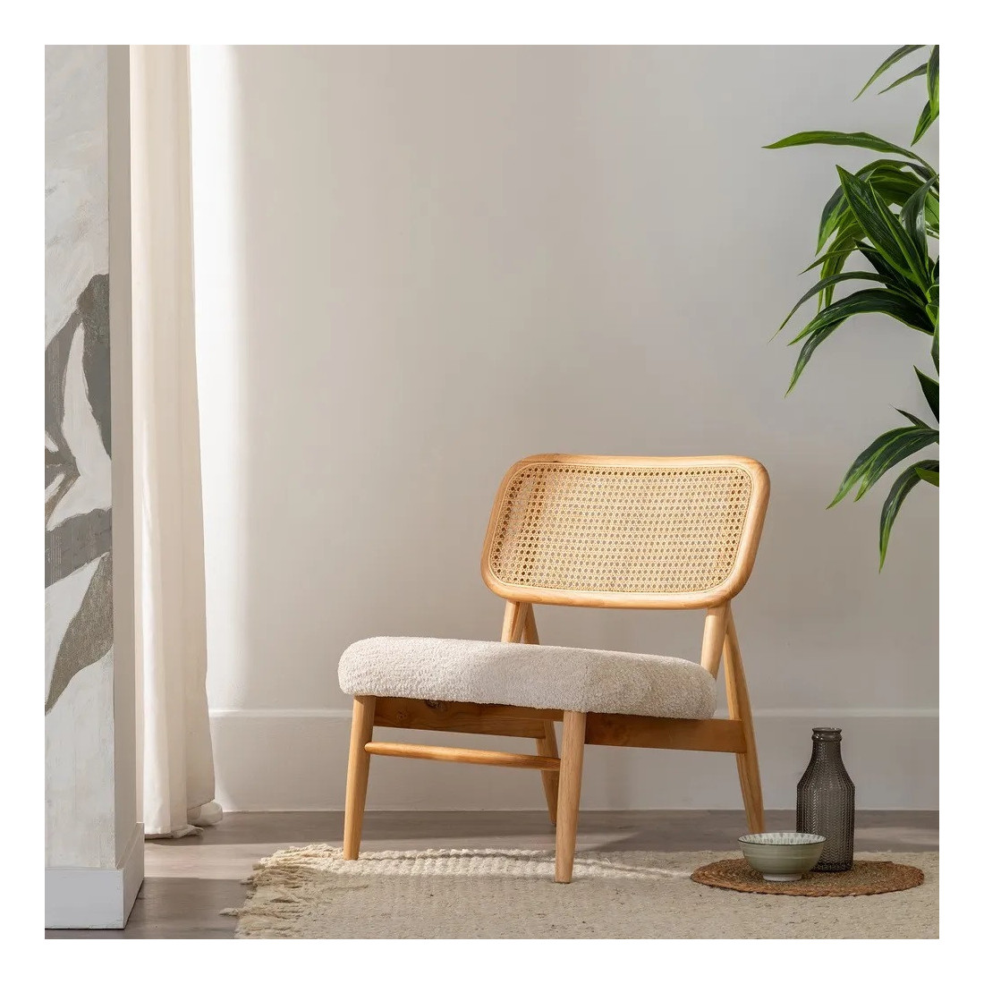 Ce fauteuil bas d’intérieur vous accueille avec tout le raffinement que lui offrent la noblesse des matériaux qui le composent. Il s’agit en effet d’un fauteuil de salon conçu en bois massif d'hévéa avec son dossier en rotin pour la partie structurelle, et en tissu bouclette beige pour la partie assise rembourrée en mousse à la densité de 25 kg/m2. Leur union se traduit par un caractère bicolore qui les met tous deux en valeur : du beige pour son tissu, du naturel pour le bois, afin de créer un fauteuil lounge bois et tissu design dans des tons discrets mais élégants et modernes.