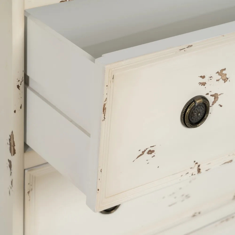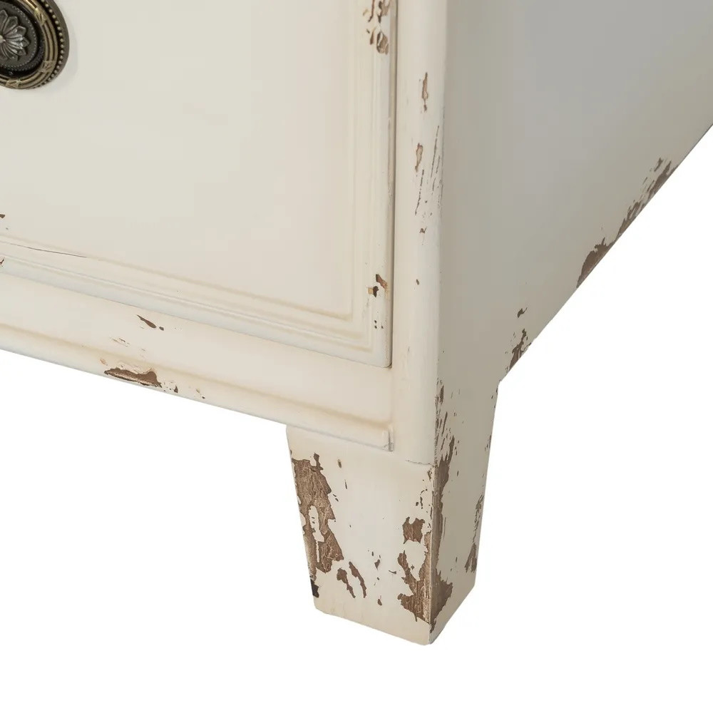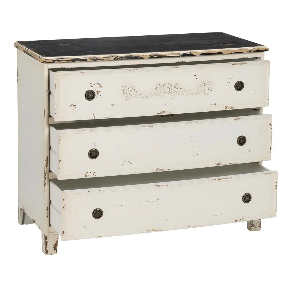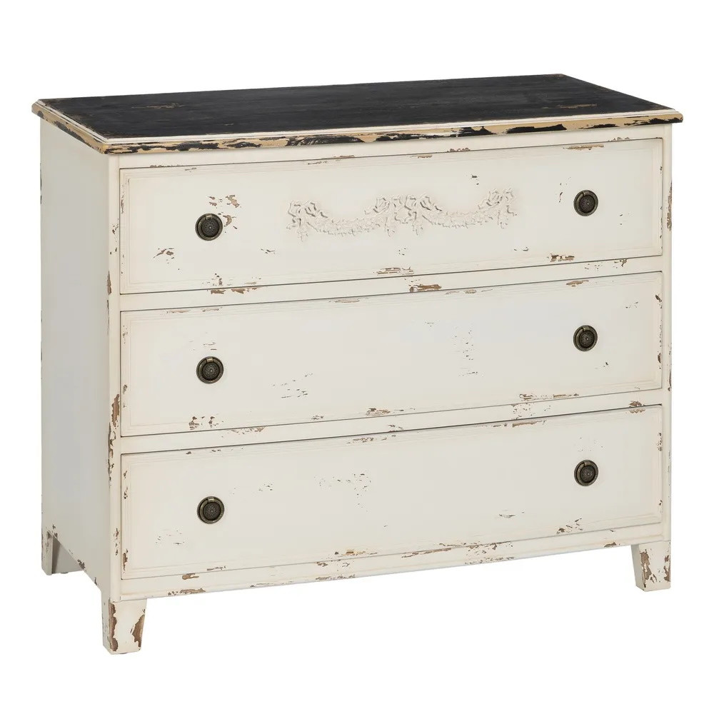 Cette commode 3 tiroirs séduit par son allure rétro qui évoque également le style champêtre par sa patine et ses poignées en laiton à la forme d'anneaux effet vieilli qui lui confèrent un charme authentique. Son allure avec sa sculpture sur le premier tiroir du haut et son plateau foncé effet vieilli n’en paraît que plus délicate et raffinée, et sent bon le style rétro qui rassure et apaise. La teinte crème de cette commode couleur pastel est idéale pour créer une chambre lumineuse et aérée.