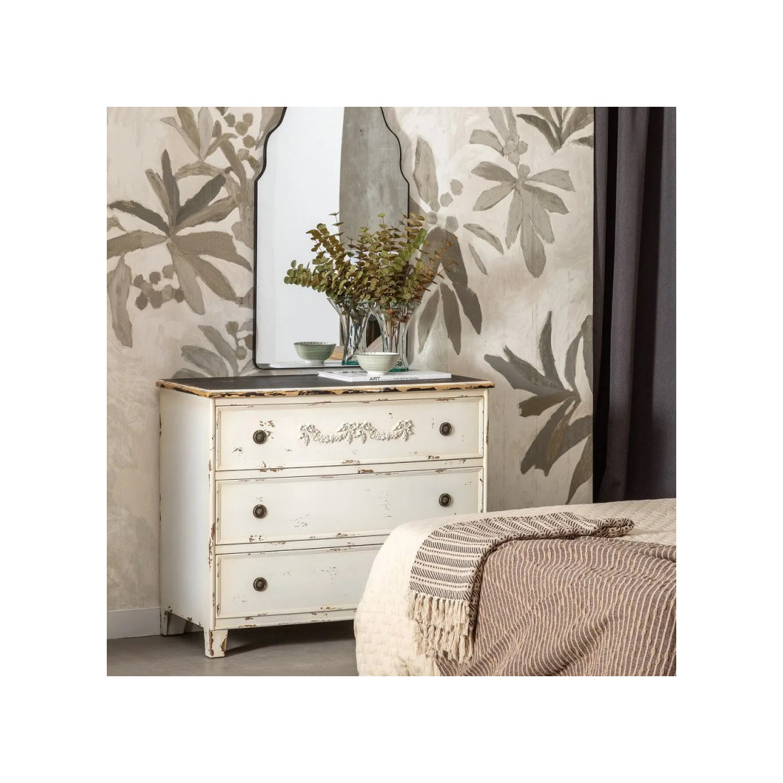 Meublez votre chambre avec délicatesse et douceur avec cette commode en bois effet vintage, dont la couleur crème et les moulures raffinées vous apporteront calme et volupté au cœur de votre pièce de repos ! Dotée de 3 tiroirs, elle est un incontournable de la chambre cosy, où on aime se relaxer et passer du temps avec soi. Mariez là avec une tête de lit capitonnée ou dans des tons sobres et doux comme le teint beige qu’elle arbore afin de créer une atmosphère apaisante et presque onctueuse, qui vous donnera envie de prendre soin de vous.
