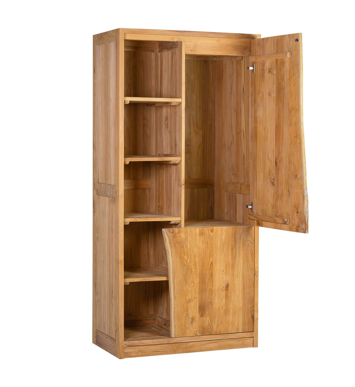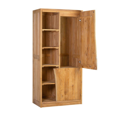 Un armoire moderne et originale pour votre chambre à coucher ou votre dressing. Réalisée en bois de teck massif et entièrement fabriquée à la main, cette armoire vous séduira par ses façades de portes taillées directement dans le tronc de l'arbre et volontairement laissées dans cette forme originale qui lui donnent un énorme cachet. Avec ses nombreux caissons de rangements, vous serez assurés d'y stocker toutes vos affaires, sans oublier sa partie penderie très pratique pour vos chemises et robes.
