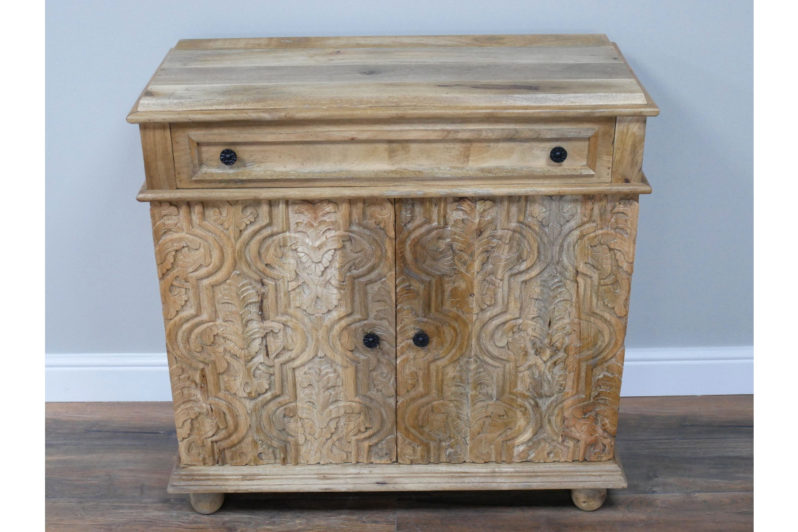 Avec ses portes entièrement sculptées à la main, ce meuble d'appoint a été réalisé dans un bois massif de manguier avec 2 finitions qui vous sont proposées : blanchie ou en bois naturel.