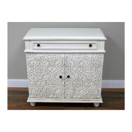 Un petit meuble d'appoint avec 1 tiroir idéal pour votre hall d'entrée ou autre pièce de la maison qui offrira beaucoup de charme à votre décoration d'intérieur. Les portes minutieusement sculptées dans des formes géométriques et motifs floraux font de ce meuble d'entrée une pièce unique pour votre maison.