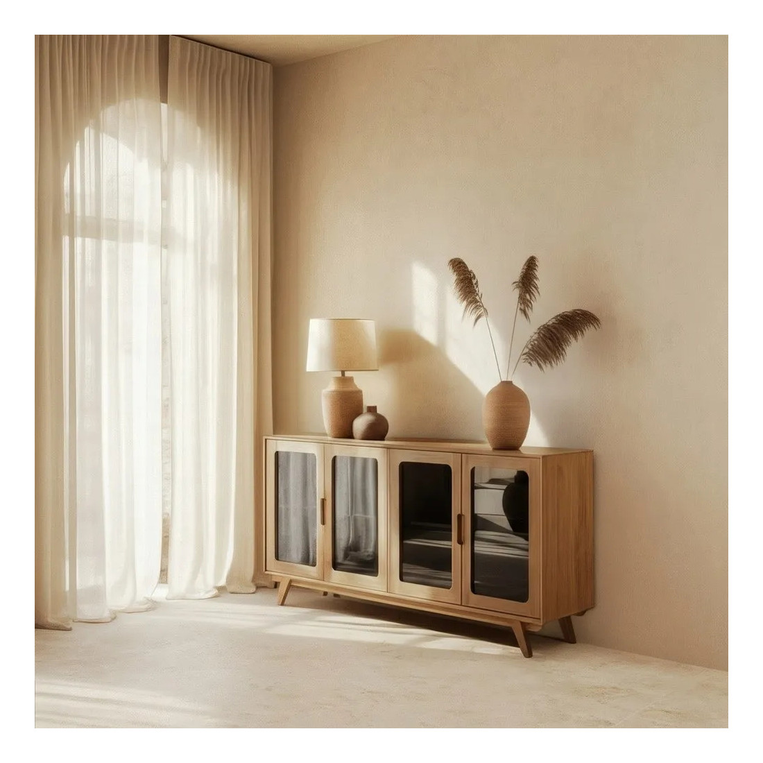 Réalisé en bois de manguier massif, ce buffet dispose de 4 portes en verre. Son look rétro est tout à fait dans l'air du temps. Il sera parfait dans la cuisine comme dans la salle à manger. Il vous offre de nombreux rangements. En effet, derrière chacune de ses portes se trouve une étagère pour l'organisation de votre vaisselle. Son verre teinté permet de ne pas laisser apparaitre vos affaires.