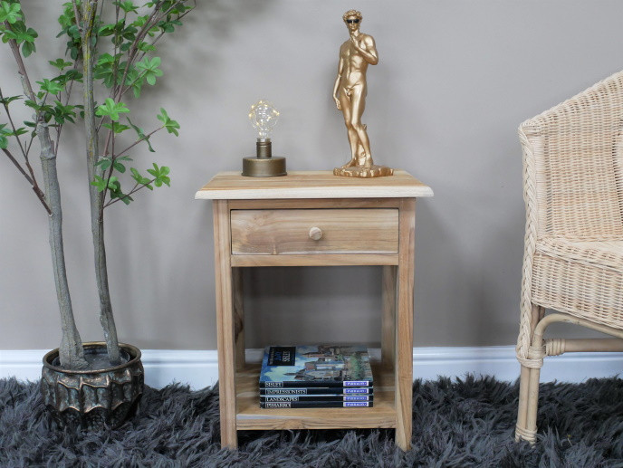 Ce magnifique chevet est entièrement réalisé en bois de teck brut. Il dispose d'un tiroir pour organiser vos affaires personnelles et les avoir toujours à portée de main lorsque vous serez confortablement installé dans le lit. En partie basse de la table de chevet vient une tablette qui accueillera un peu de décoration pour embellir votre chambre à coucher.