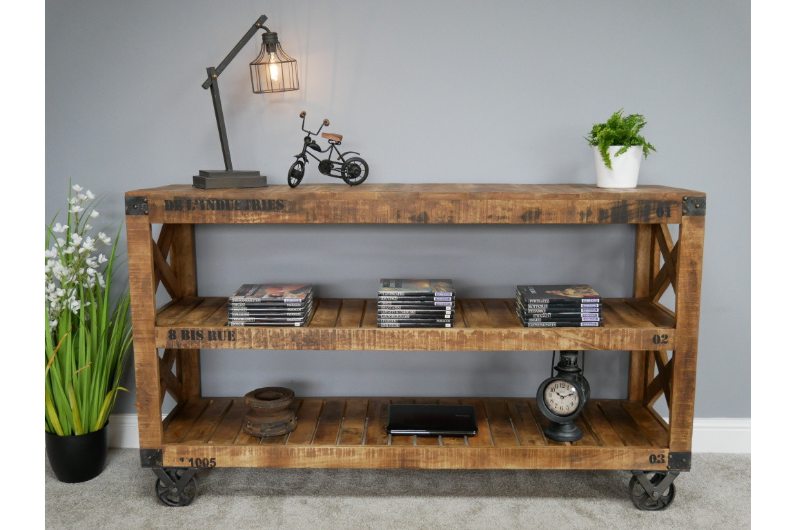 Avec son mariage entre bois vieilli et métal usé, cette desserte roulante a tout pour offrir à votre cuisine un style industriel authentique. La structure en bois massif de manguier supporte de longues étagères robustes qui offrent donc des rangements sur trois niveaux. L’idéal pour apporter le petit déjeuner dans la chambre ou débarrasser une table à manger autour de laquelle de nombreux convives ont pris part au repas ! Elle peut naturellement constituer aussi un meuble d’appoint où bon vous semble, pour le plaisir d’offrir à votre intérieur un meuble style industriel.
