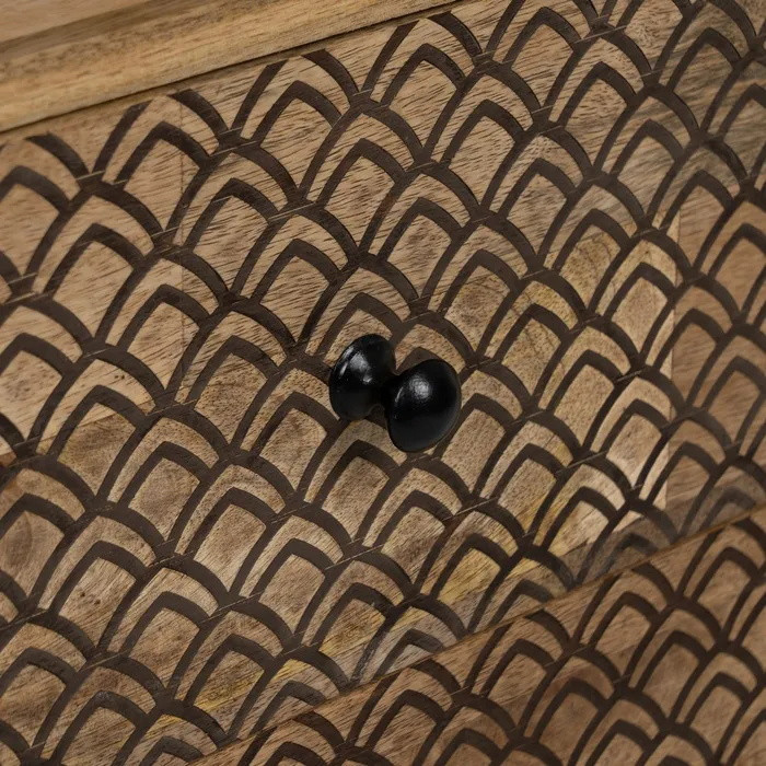 Naturelle et authentique, cette grande table de chevet est entièrement fabriquée en bois massif de manguier. Elle dispose d'une niche en partie haute très pratique pour y glisser votre livre ou votre paire de lunettes une fois que vous aurez goûté à la chaleur de la couette. Puis en partie basse viennent deux tiroirs à la façade sculptée pour vous organiser au mieux.