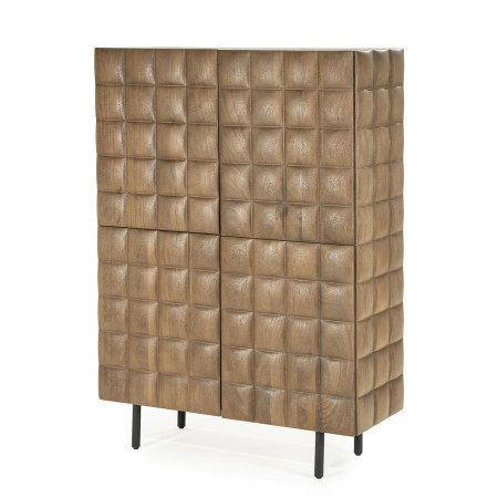 L'armoire haute 4 portes damier Félix est fabriquée en bois de manguier massif et repose sur un piètement en métal noir. Elle dispose de 4 portes, de 4 étagères de rangement au total et sa façade ainsi que les côtés du meuble sont texturés de style damier ce qui lui apporte un côté dynamique et moderne.