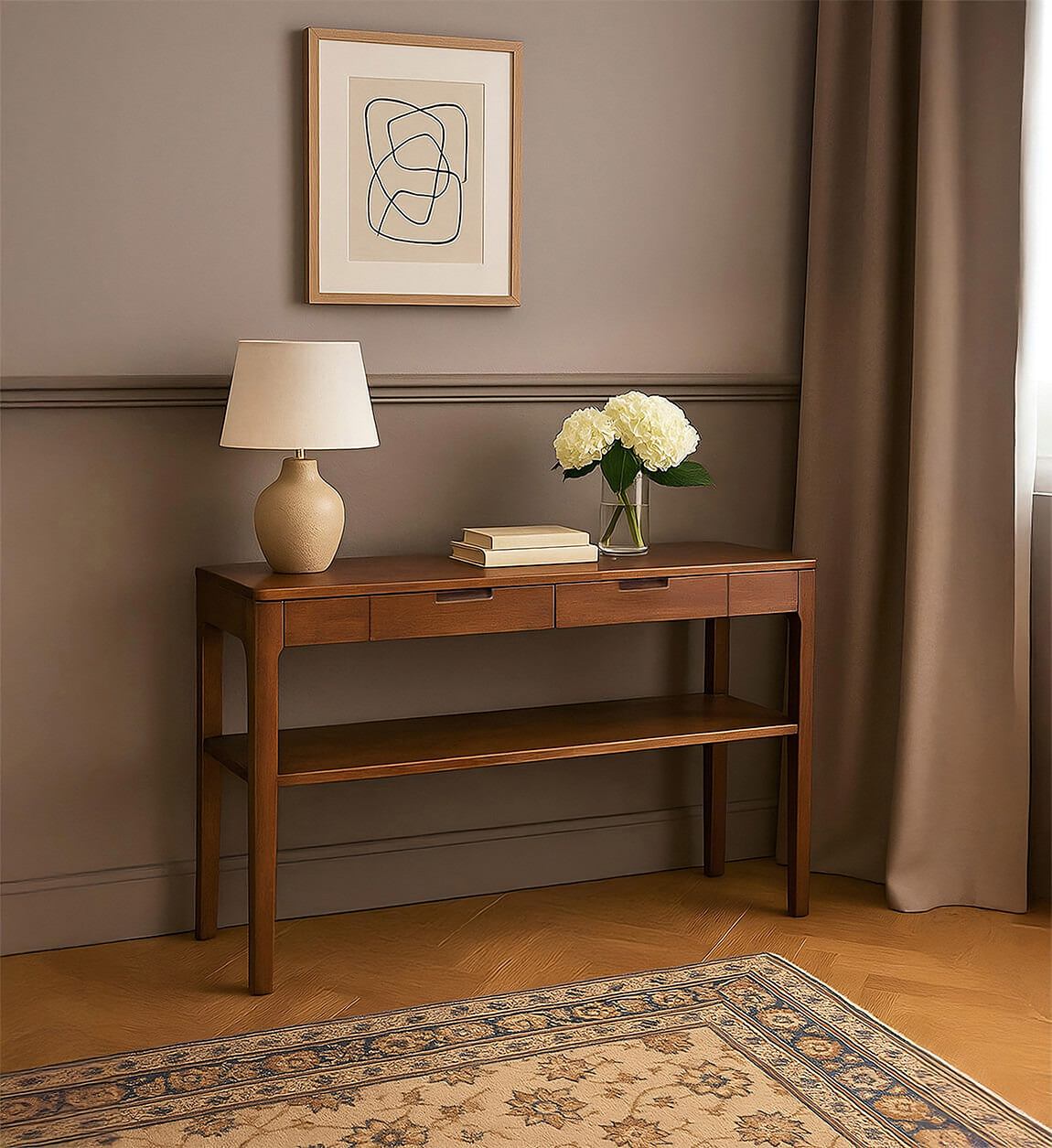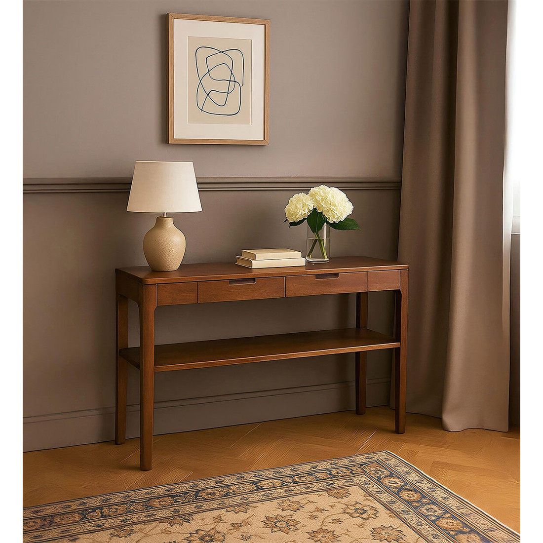 Cette console en bois massif d'acajou à double plateau vous présente son design simple et épuré aux bords arrondis, à placer comme meuble d’entrée ou partout où vous avez besoin d’un meuble d’appoint. Sa conception en bois d'acajou teinté marron lui confère un aspect très chic qui s’accorde avec la sobriété de son design. Deux plateaux sont en effet simplement soutenus par quatre pieds tandis que 2 tiroirs très pratiques sont placés au centre de la console, offrant une structure totalement ouverte permettant d’exposer pleinement vos objets de prédilection.