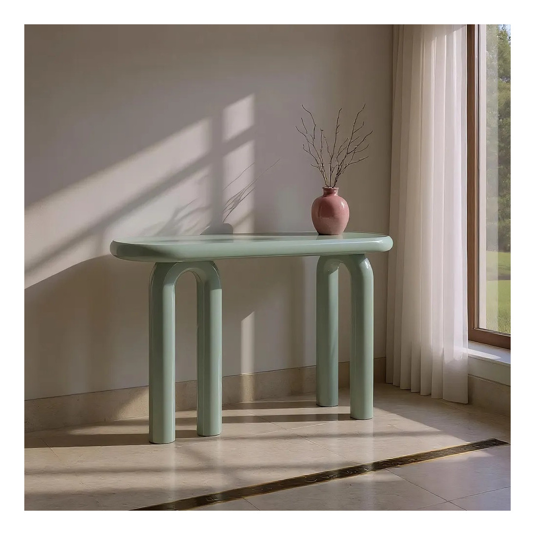 Cette console élégante, moderne, ovale et laquée aux formes géométriques s'intègrera à merveille dans un intérieur de style contemporain. La console design et minimaliste sera pratique dans une entrée pour vous défaire de vos clés et de votre courrier dès le pas de la porte passé. Vous pourrez déposer sur son plateau vos plus beaux bibelots, un miroir ou le cadre de votre choix pour réchauffer la décoration de la pièce. Son faible encombrement vous permet également de la placer dans un couloir. Disponible en deux teinte à savoir le blanc et le vert selon vos goûts et votre déco.
