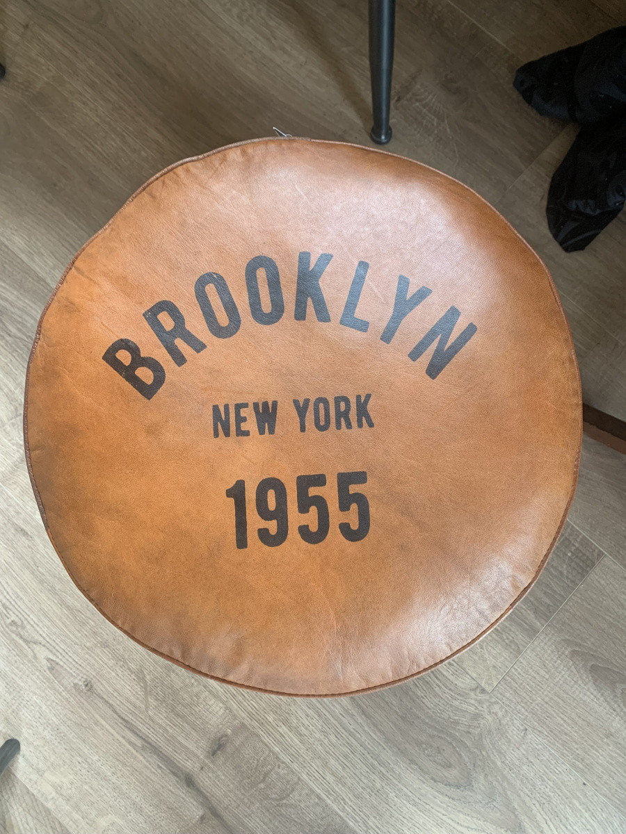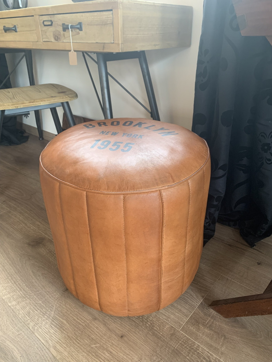 Ce pouf rond recouvert d'un magnifique cuir de chèvre pleine fleur effet vintage de couleur cognac saura compléter votre décoration d'intérieur au style Industriel. Son rembourrage est en coton recyclé, tandis que son inscription "Brooklyn New York 1955" au niveau de son assise vient apporter cette originalité qui lui va si bien !